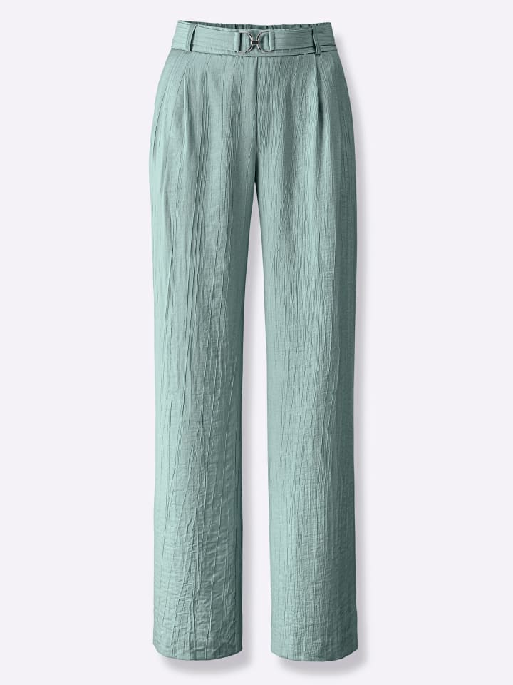Смесовая вискозная ткань с легким мерцанием и модные широкие брюки: эти брюки - настоящая изюминка! Эластичный пояс с гладкой передней частью создает привлекательный силуэт. Фиксированный пояс с декоративной пряжкой завершает образ. Два кармана в боковых швах добавляют элегантности. Плиссировка спереди идеально дополняет свободный стиль. Ширина брючины: около 60 см.
