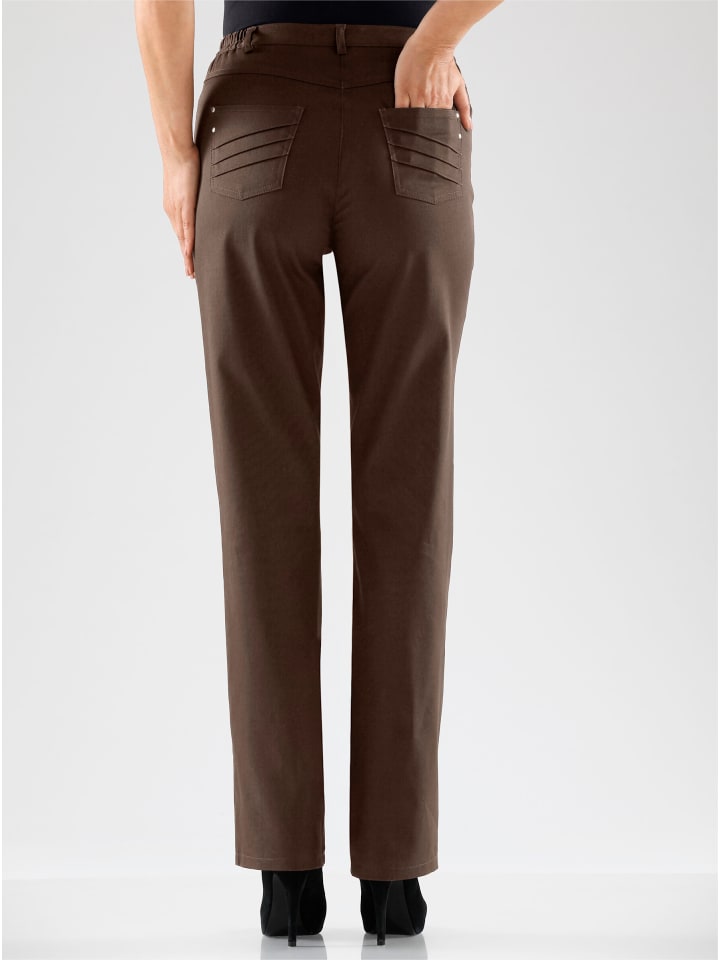 Брюки благодаря популярной нано-обработке отталкивают грязь, не мнутся, дышащие и простые в уходе. Шлевки для ремня и эластичный пояс по бокам. Два передних кармана и задние карманы украшены складками и заклепками. Длина брючины примерно 44 см. Ремень в комплект не входит.