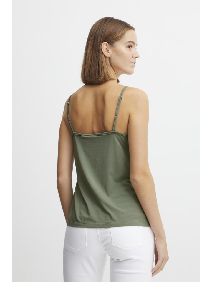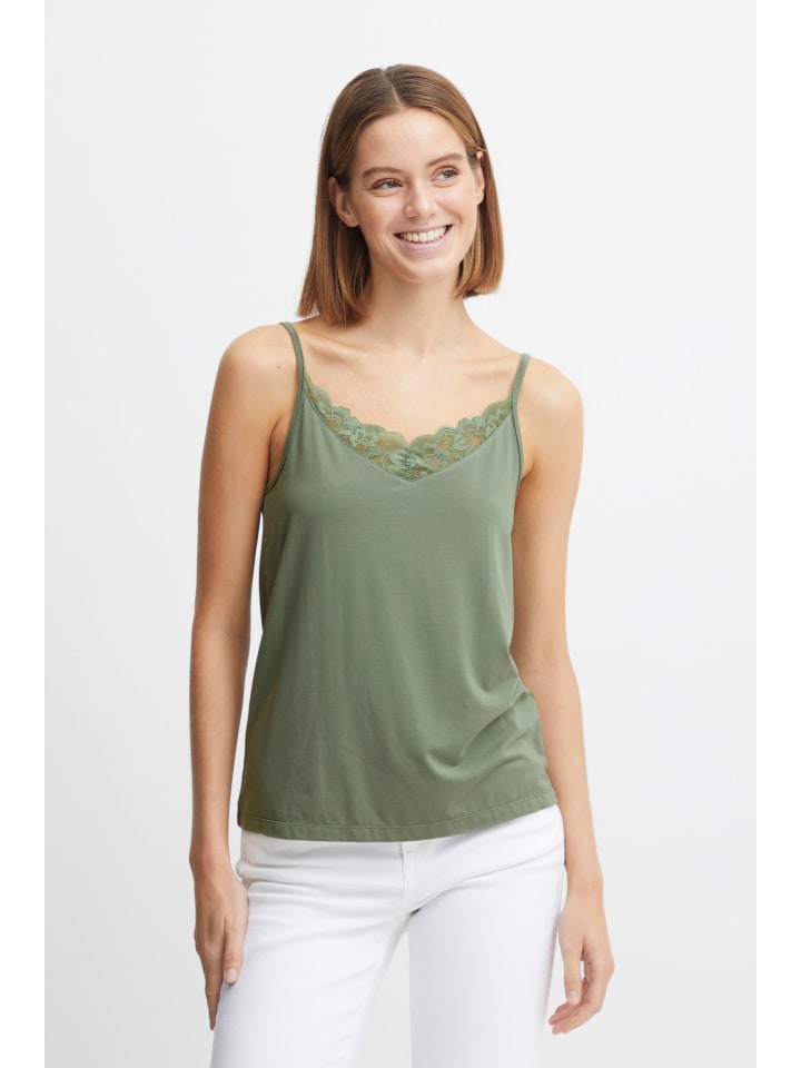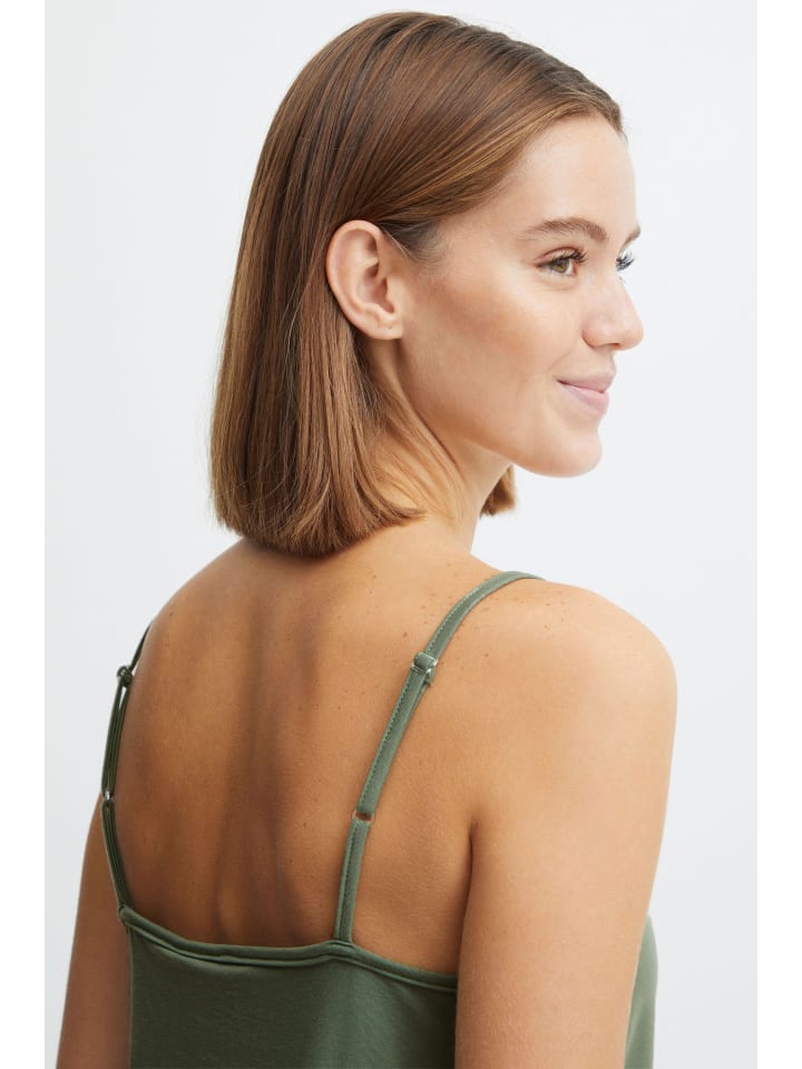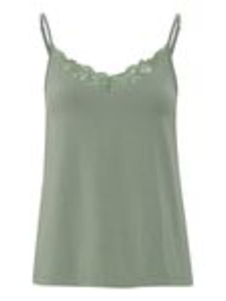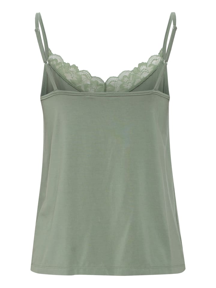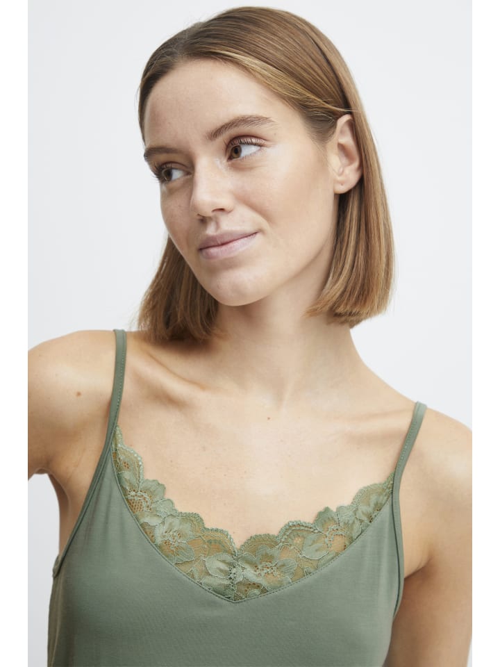Топ-комбинация с регулируемыми бретелями и нежной кружевной отделкой на V-образном вырезе. Прямой крой и гладкий внешний вид создают легкий прохладный эффект.