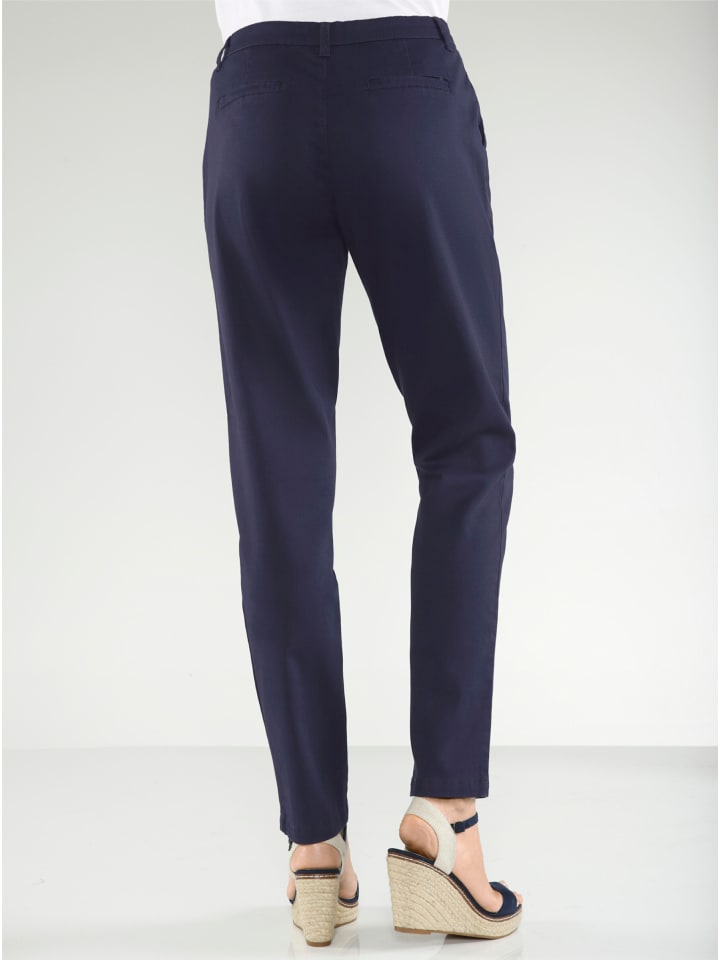Брюки из прочной эластичной ткани в удобном стиле чинос. Два косых боковых кармана и декоративная отделка сзади. Застежка на пуговицы и молнию спереди. Шлевки для ремня. Мягкая саржевая ткань. Длина брючины примерно 34 см. Ремень в комплект не входит.