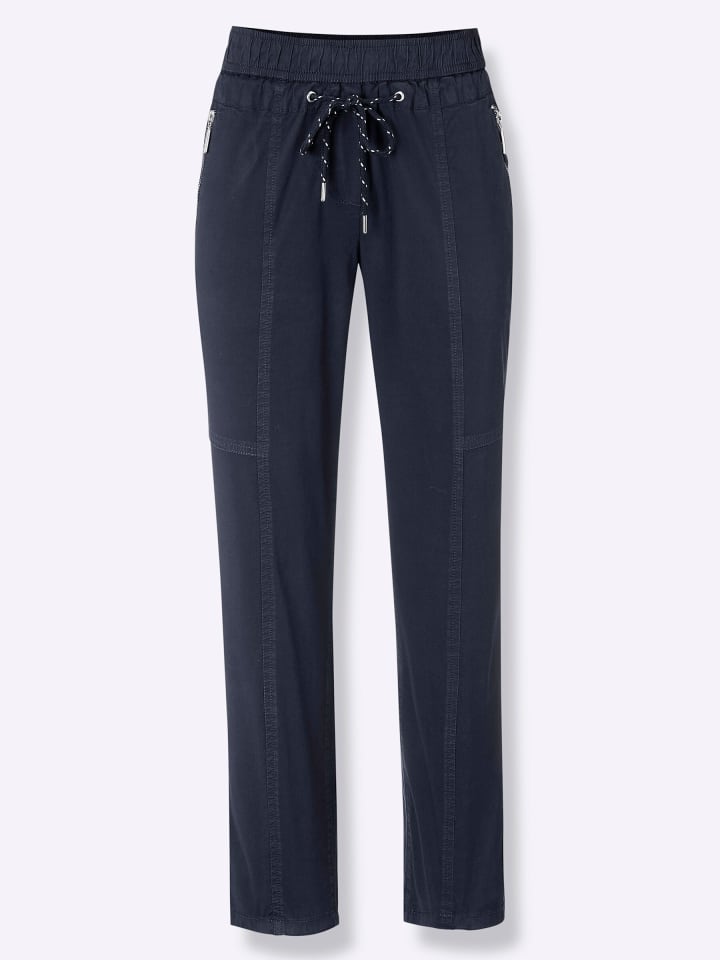 Просто наденьте их, и вы готовы к выходу: приятные и легкие брюки длиной 7/8 с очень удобным поясом на резинке по всему периметру, завязывающимся шнурком. Практичность: два косых кармана на молнии и два накладных кармана сзади. Передние швы визуально удлиняют штанину. Длина брючины примерно 36 см. Соответствует инициативе «Сделано в Африке с хлопком».
