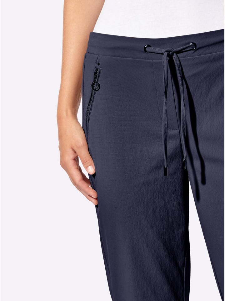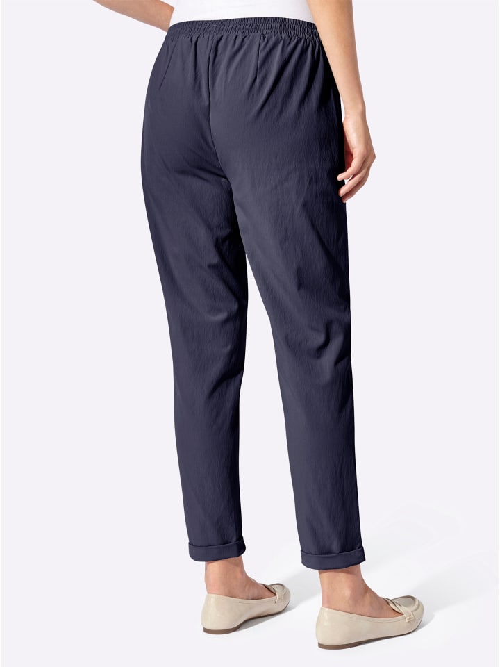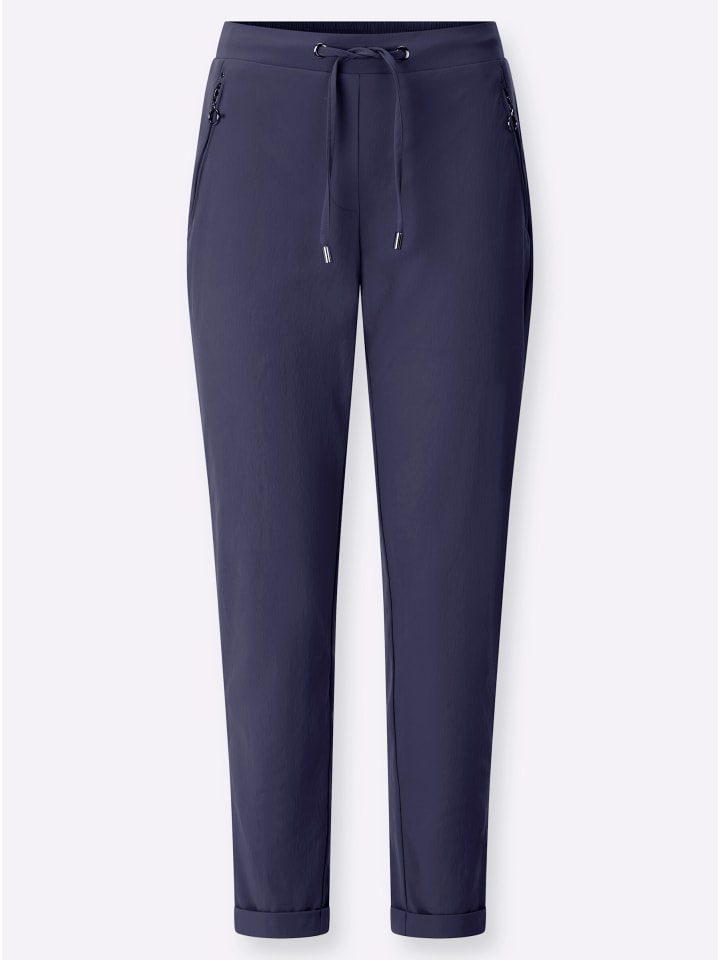 Просто наденьте их и чувствуйте себя комфортно: брюки с эластичным поясом сзади, завязывающимся шнурком и завязкой. Эффектные серебристые детали. Два декоративных боковых кармана, косой боковой шов и фиксированные отвороты на штанинах. Длина штанин примерно 34 см.