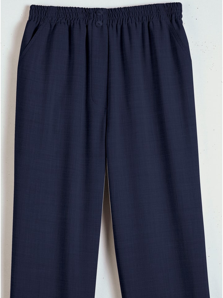 Дорожные брюки с эластичным поясом и двумя боковыми карманами. Внутренний карман на поясе и дополнительный карман внутри правого внутреннего кармана. Имитация молнии с двумя декоративными пуговицами спереди. Изготовлены из ткани би-стрейч.