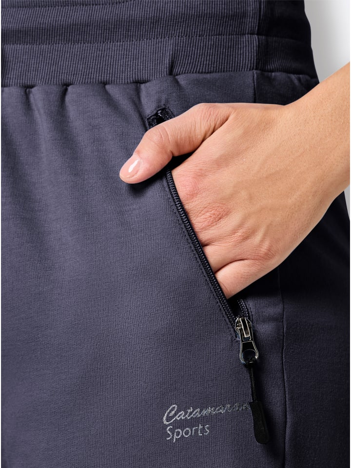 Незаменимая вещь в жаркую погоду: эти брюки для отдыха от Catamaran Sports выполнены из легкой ткани свитшота длиной «бермуды» с поясом на резинке, кулиской и контрастным шнурком по внешнему краю. Практичные особенности включают два боковых кармана на молнии, один с логотипом, и прорезной карман на липучке сзади справа. Сохраняют форму и удобны. Прямой подол с боковыми разрезами. Соответствует инициативе «Хлопок, сделанный в Африке».