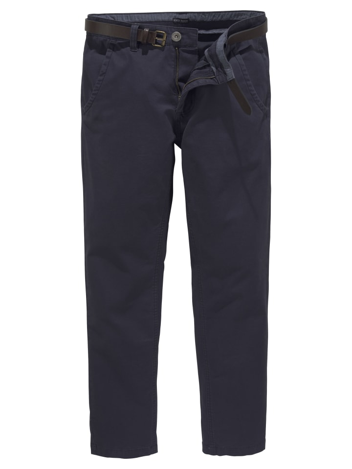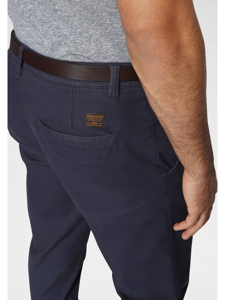 Брюки-чиносы Bruno Banani с поясом. Фирменная этикетка сзади. Застежка на пуговицу и молнию. Два передних кармана. Два прорезных кармана сзади. Ремень с пряжкой. Мягкая эластичная ткань.