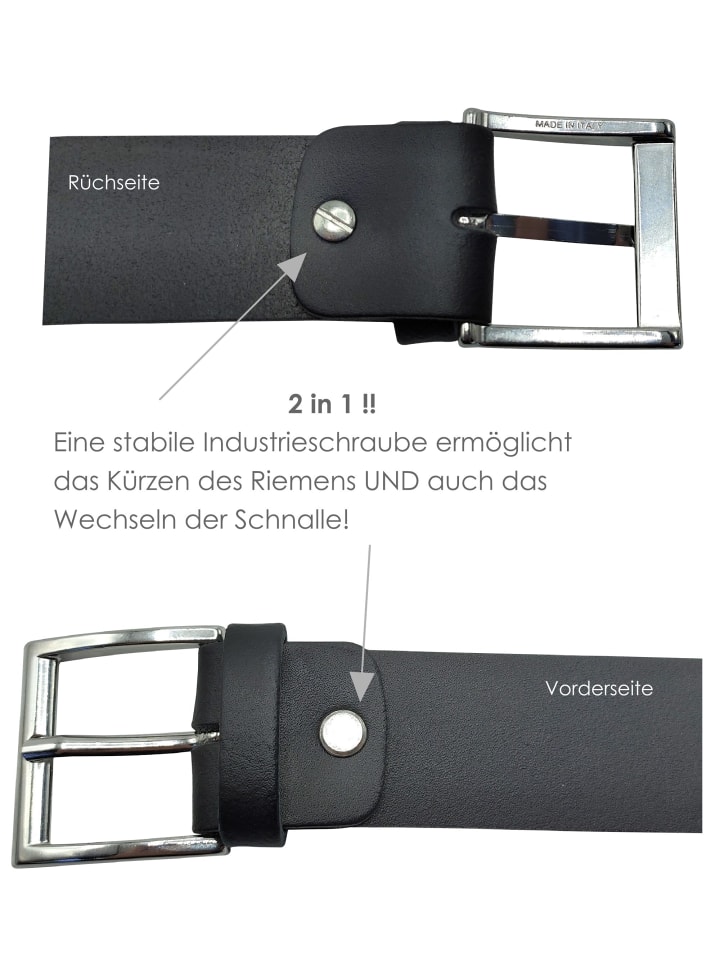 Вневременной классический ремень из натуральной прочной воловьей кожи (однослойный, прокрашенный насквозь, без слоев) с простой пряжкой-клинком серебристого цвета. Небольшой декоративный стразы приклеплены к петле в качестве привлекающей внимание детали. Ширина ремня около 38 мм, он универсален, всегда элегантен, не вычурен, а скорее повседневен и спортивного стиля. Гарантированная толщина ремня из натуральной кожи составляет около 2,6 мм. Большие размеры до окружности талии 130 см. Сделано в Германии; соответствует требованиям EU REACH. Ремешок можно легко укоротить благодаря винту. Пряжка легко заменяется. Подойдут ВСЕ пряжки для ремней шириной 4 см! В комплект входит дополнительный винт из нержавеющей стали.