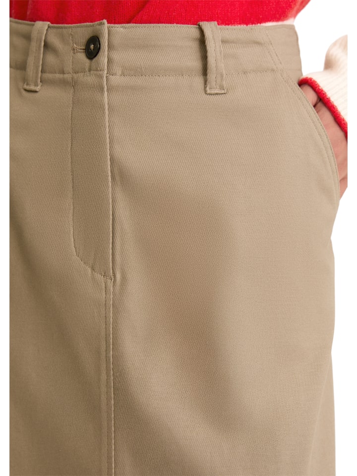Классический модный тренд и абсолютный фаворит стиля: юбка миди! Носите ее с плотными колготками или слегка загорелыми штанинами - в зависимости от погоды. Эта юбка изготовлена из высококачественной эластичной органической хлопковой смеси с высоким содержанием мягкого лиоцелла. Дизайн чистый и выразительный, с классическим приталенным поясом, косыми накладными карманами спереди и центральными швами спереди и сзади. Юбка имеет элегантный А-силуэт и без подкладки.