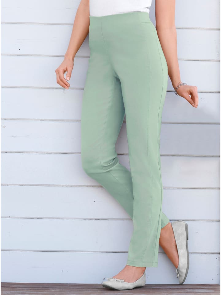 Визуально стройнит! Удобные брюки с широким поясом на резинке по всему периметру. Благодаря эластичной ткани они повторяют ваши движения. Длина брючины примерно 36 см.