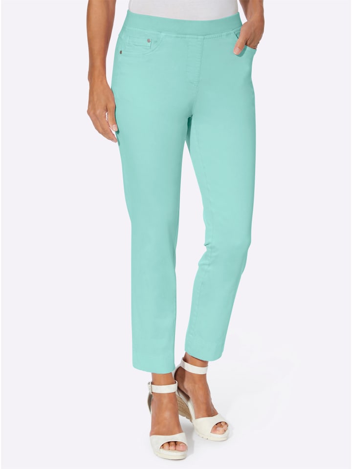 Мягкие! Мягче! Супермягкие брюки 7/8 из мягкого высококачественного материала! Мягкий трикотажный пояс с внутренней резинкой обеспечивает еще больший комфорт. Спереди - имитация молнии, сзади - приталенная кокетка. Модель с пятью карманами, украшенная заклепками на двух передних карманах (включая дополнительный карман для монет) и накладных карманах сзади. Длина брючины примерно 38 см. Ремень в комплект не входит. Поддерживает инициативу «Сделано в Африке» (Catton made in Africa).