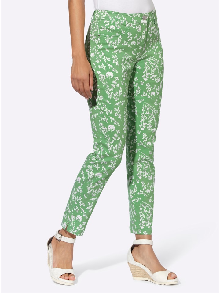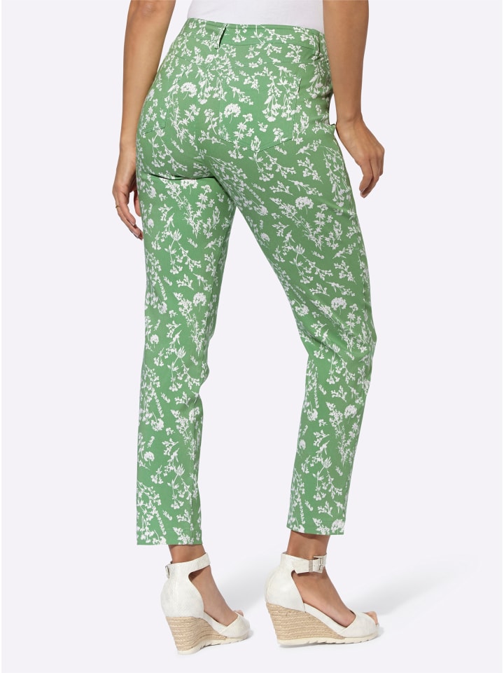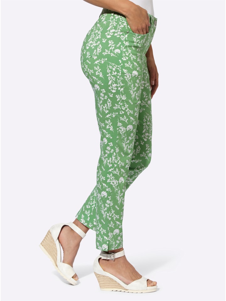 Эти брюки из бенгалина впечатляют своим модным цветочным рисунком, а также своей эластичностью, сохраняющей форму и комфортом. Они имеют фигурный пояс со шлевками для ремня, застежку на пуговицу и молнию спереди, два передних кармана и два накладных кармана сзади. Сзади брюки имеют приталенную кокетку и небольшие боковые разрезы по низу брючин. Длина брючины составляет около 34 см. Ремень не входит в комплект.