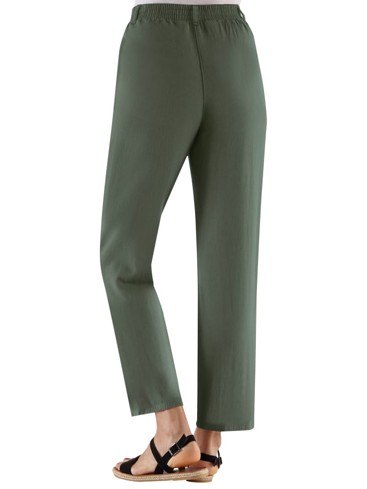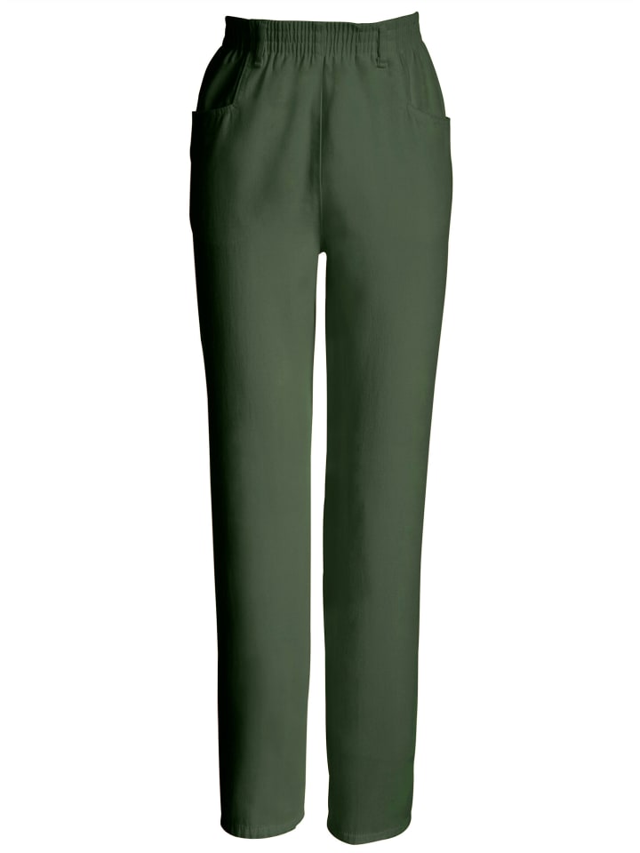 Брюки с удобным эластичным поясом, шлевками для ремня и двумя практичными карманами. Ширина брючины примерно 42 см.