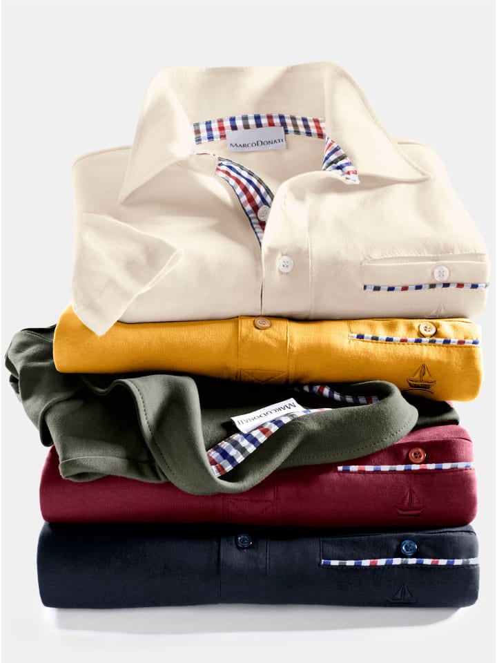 Эта рубашка с короткими рукавами яркая, как лето, с контрастной отделкой на воротнике-поло, планке с пуговицами и на нагрудном кармане. Нагрудный карман застегивается на пуговицу и украшен изящной вышивкой. Эластичные манжеты по низу. Приятная для кожи ткань.