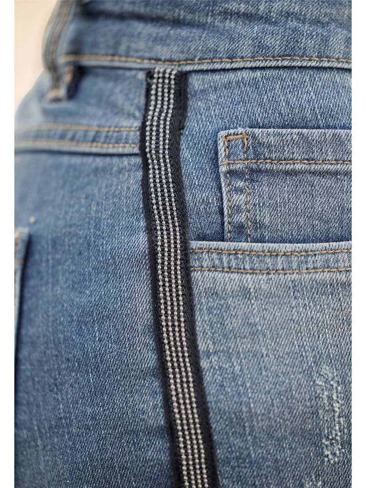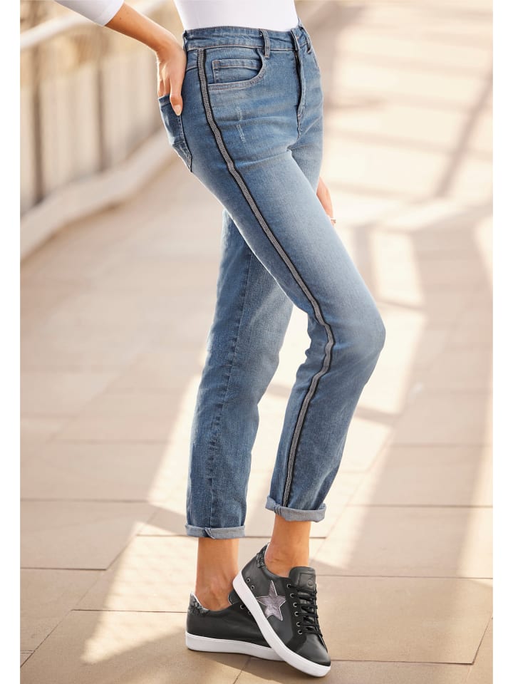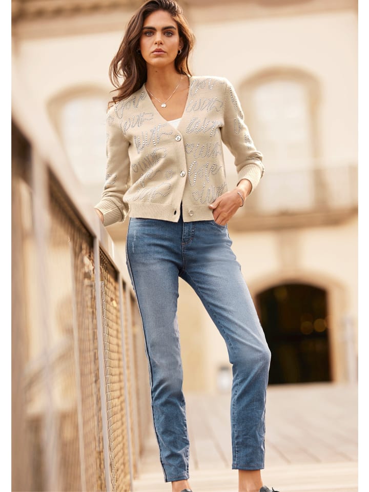 Современные джинсы с пятью карманами и небольшими декоративными бусинами на боковой полосе. Мягкая эластичная ткань с модной стиркой. Зауженный крой. Стандартная посадка. Ширина брючины примерно 30 см. Поддерживает инициативу «Хлопок, сделанный в Африке».