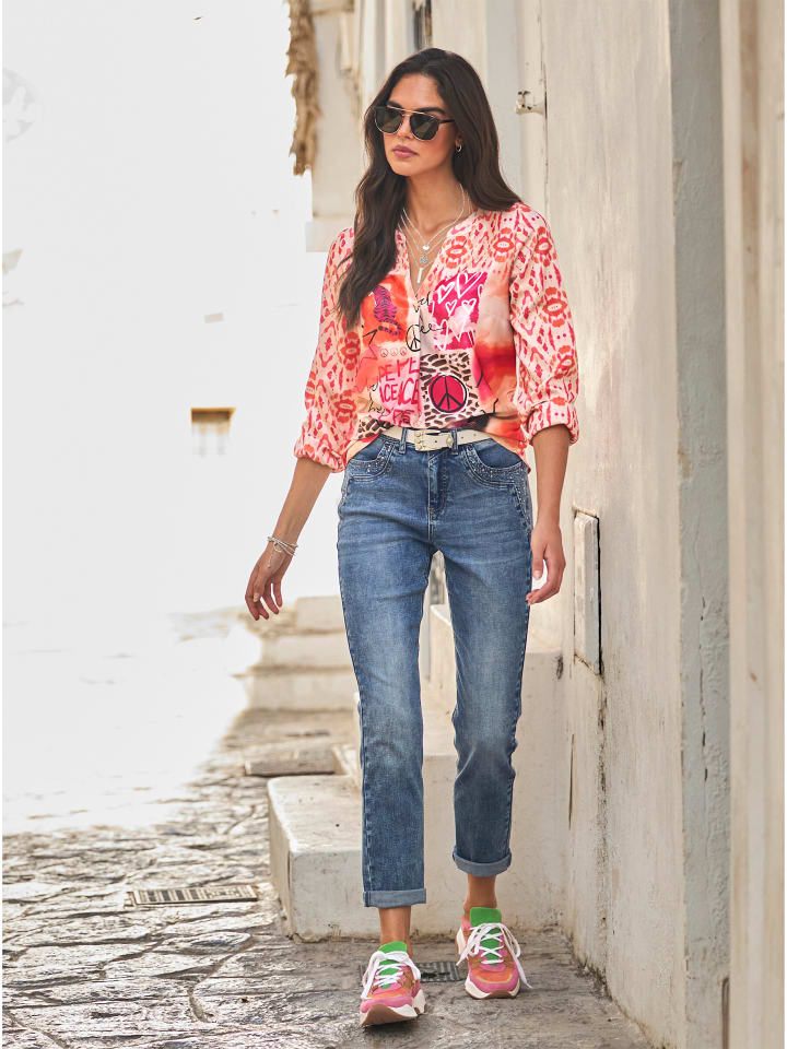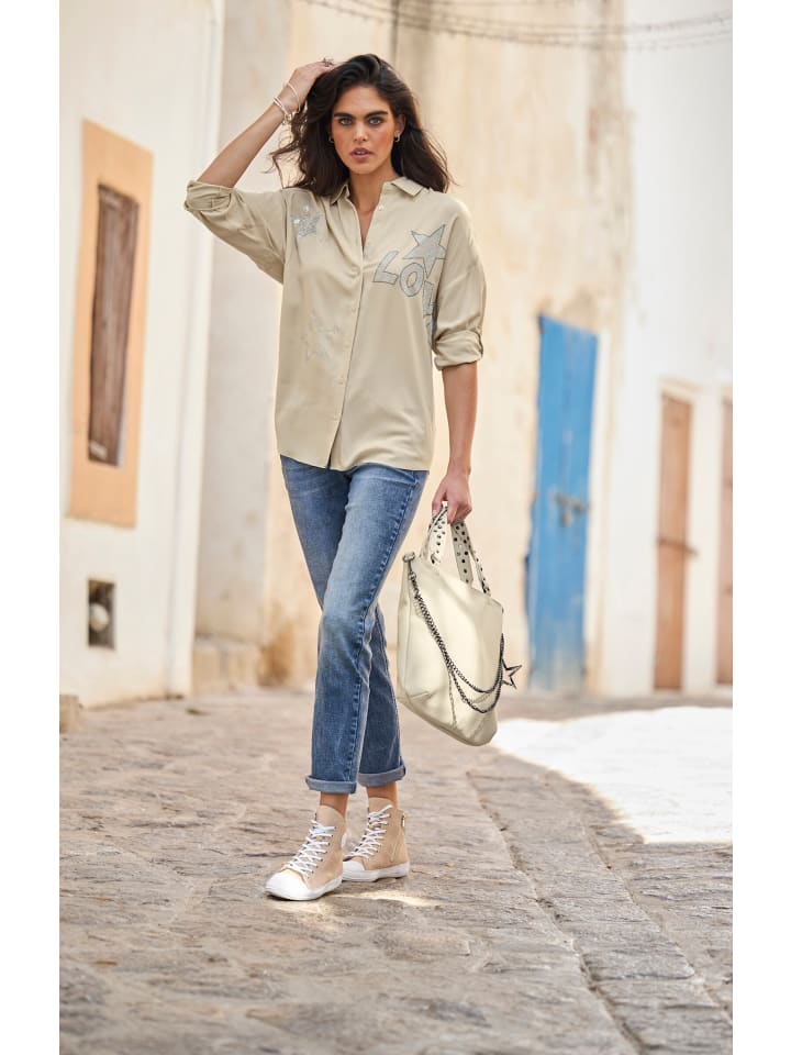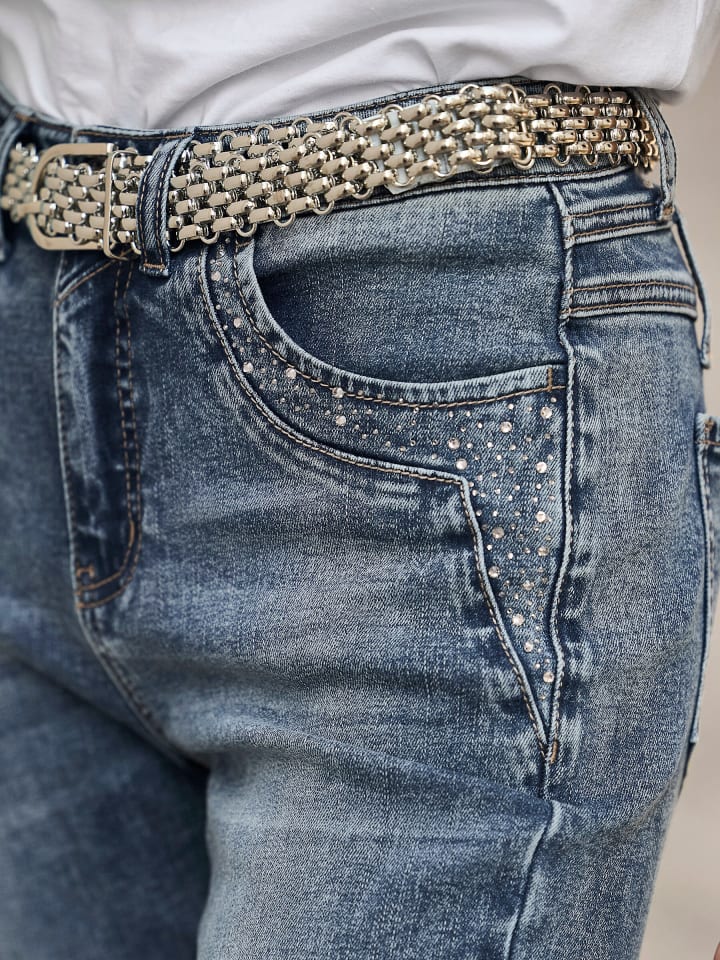 Джинсы: повседневная и универсальная вещь из мягкой эластичной ткани с модной стиркой. Передние карманы украшены сверкающими стразами; задние карманы также украшены. Стандартная посадка. Классический крой. Длина брючины примерно 36 см. Поддерживает инициативу «Хлопок, сделанный в Африке».
