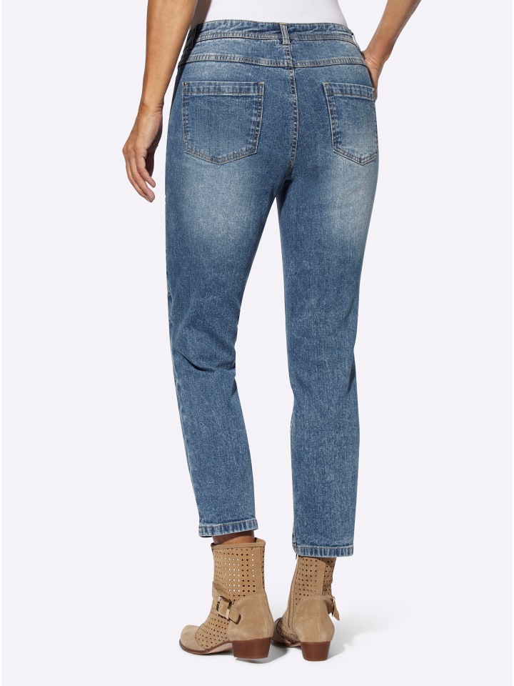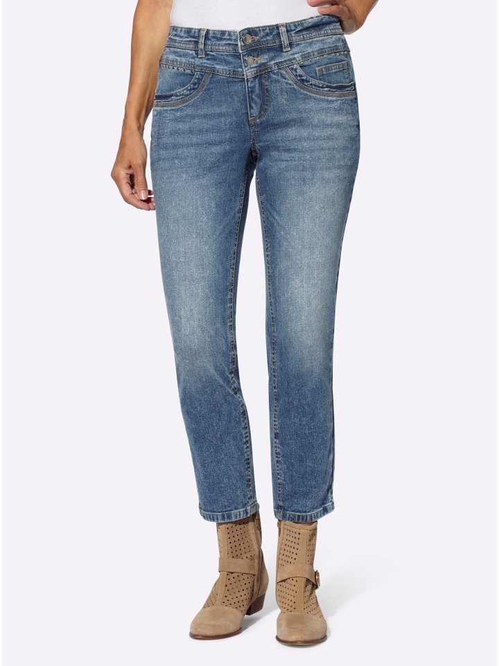 В модной расцветке: джинсы 7/8 с декоративными серебристыми заклепками на двух карманах и дополнительным карманом для монет спереди. Формованный пояс со шлевками для ремня и застежкой на пуговицу и молнию спереди. Сзади приталенная кокетка и два накладных кармана. Соответствует инициативе «Хлопок, сделанный в Африке». Длина брючины около 34 см. Ремень в комплект не входит.