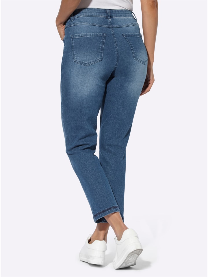 В модном потертом виде: удобные джинсы 7/8 в пятикарманном стиле с привлекательной отделкой. Декоративная застежка на пуговицы и молнию, два кармана с заклепками и вышивкой на карманах и прорезях для ног. Идеальная посадка благодаря контурному поясу с кокеткой сзади. Шлевки для ремня, ремень в комплект не входит. Длина брючины примерно 36 см. Поддерживает инициативу «Сделано в Африке из хлопка».