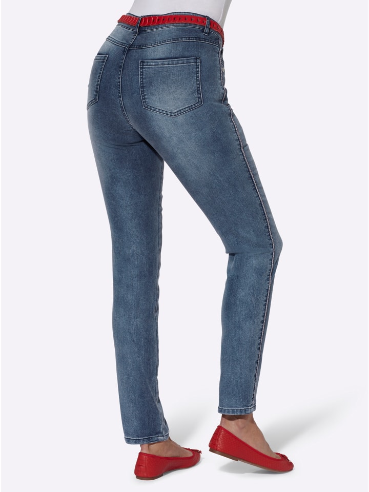 Классика, которая благодаря облегающему крою также создает эффект утягивания! Эти джинсы с пятью карманами имеют застежку на пуговицу и молнию, шлевки для ремня, два передних кармана и два накладных кармана сзади. Изюминкой являются контрастная окантовка по боковым швам и декоративная отделка люверсами на карманах. Небольшие разрезы по подолу, джинсы изготовлены из особенно мягкой и приятной на ощупь ткани. Длина брючины около 32 см. Ремень в комплект не входит.