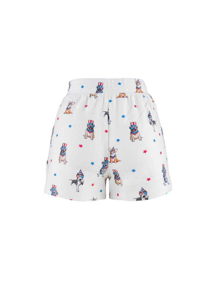 Шорты цвета слоновой кости с талией на шнурке и принтом в виде собаки США на мягкой ткани персикового цвета.