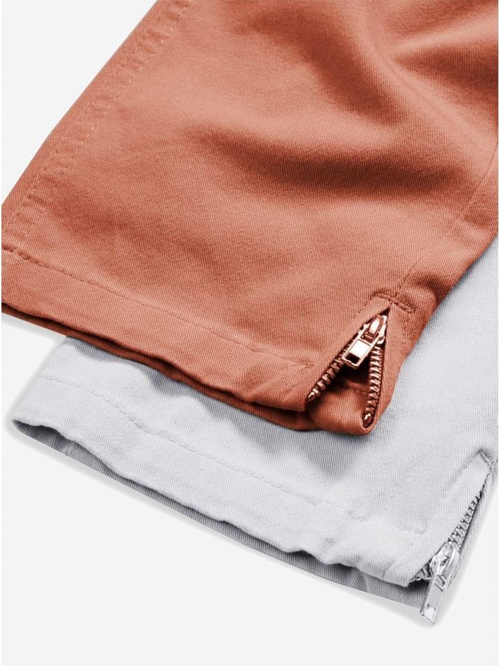 Эти брюки из твила просто необходимы! Узкий крой, фигурный пояс и шлевки для ремня. Застежка на пуговицу и металлическую молнию, два передних кармана и карман для монет. Сзади - приталенная кокетка и два накладных кармана. И самое главное: модные металлические молнии по внешней стороне брючин. Соответствует инициативе «Сделано в Африке». Длина брючины около 36 см. Ремень в комплект не входит.