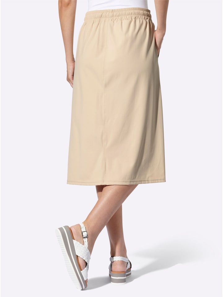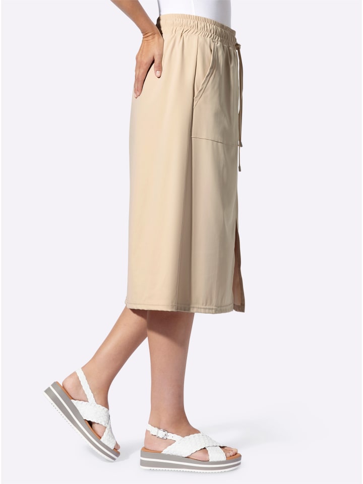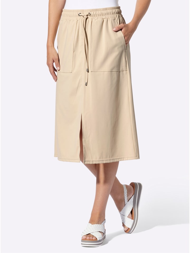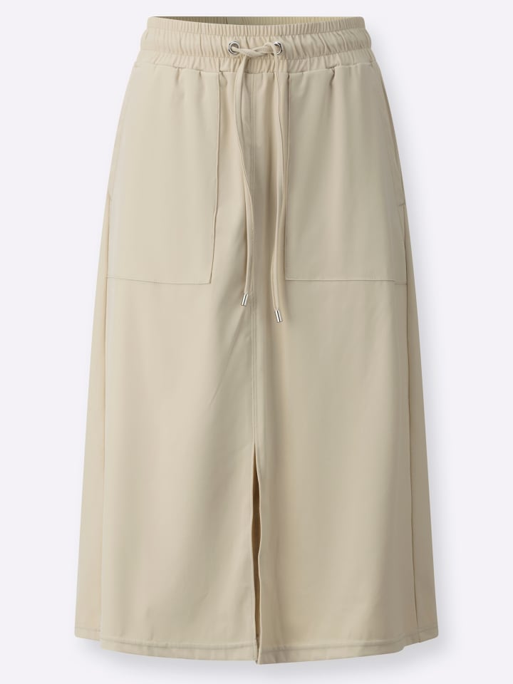 Юбка из джерси. Свободный и удобный, слегка расклешенный А-силуэт, с эластичным поясом, кулиской и завязкой. Большие накладные карманы; шлица спереди.