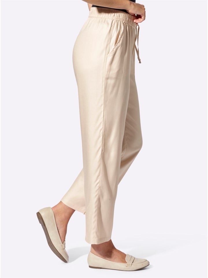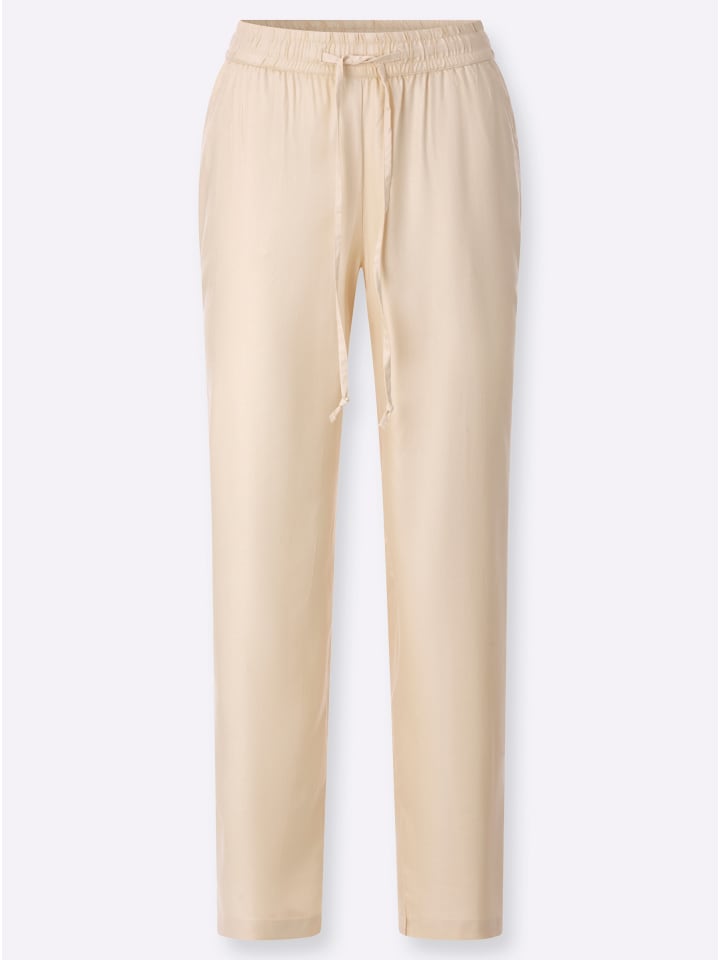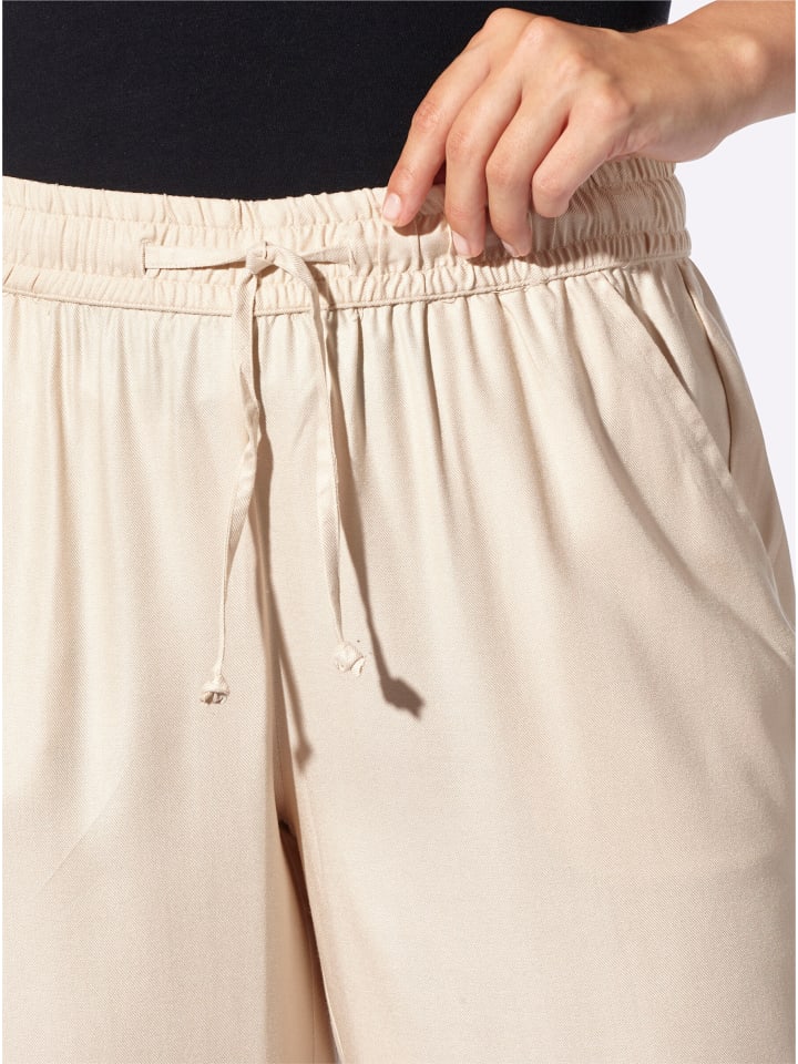Удивительно удобные, благодаря приятному для кожи качеству ECOVERO: брюки с завязками на шнурке и эластичным поясом. 2 кармана. Немного более широкий крой. Ткань с легкой текстурой. Длина брючины примерно 42 см.