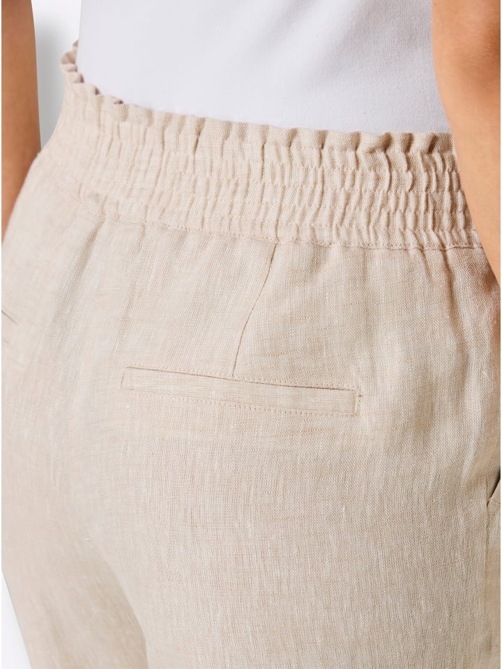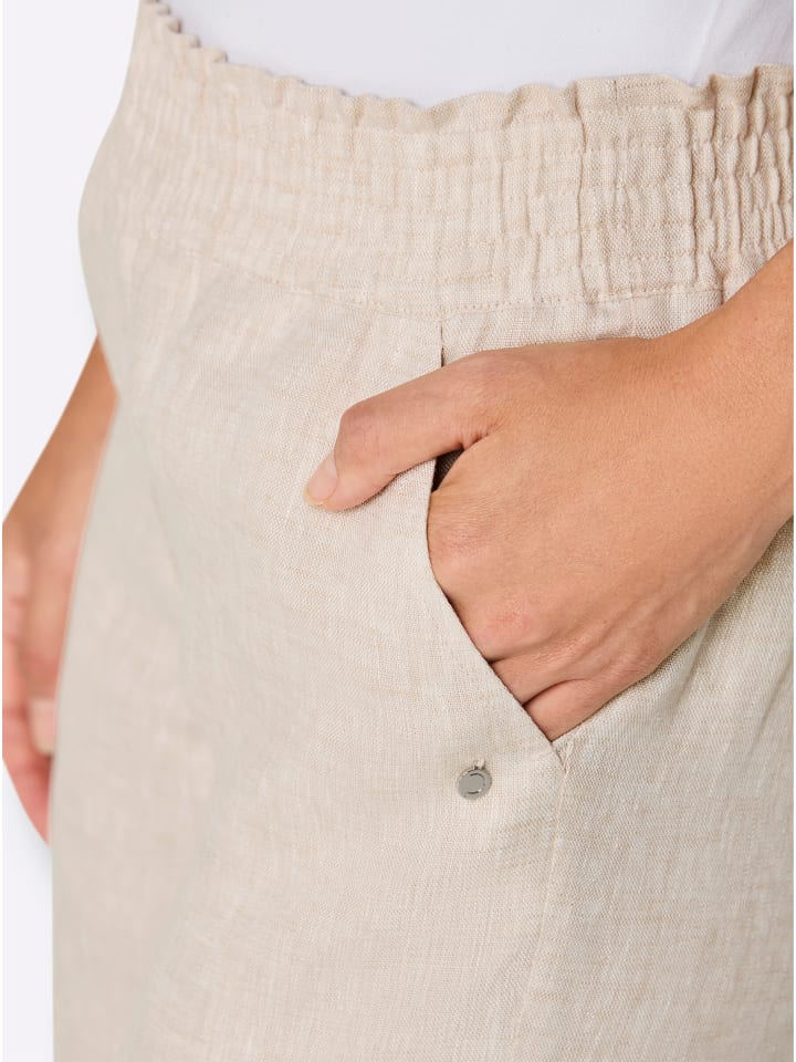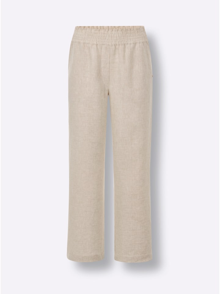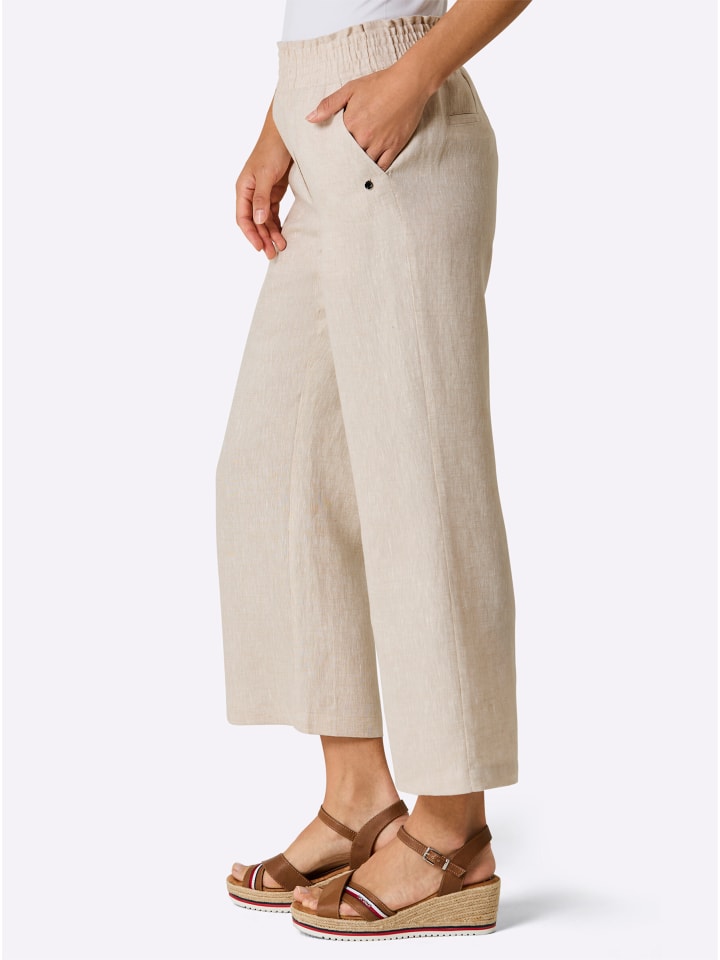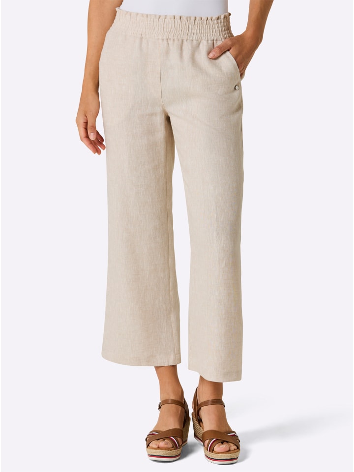Высококачественные льняные брюки-кюлоты с легкой прохладой и дышащими свойствами - особенно удобны в теплые летние дни. Широкий эластичный пояс с привлекательной отделкой идеально облегает любую фигуру. Вытачки на ягодицах обеспечивают оптимальную посадку. С двумя карманами и небольшой подвеской-логотипом. Длина брючины примерно 58 см.