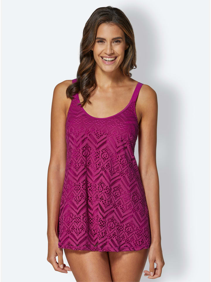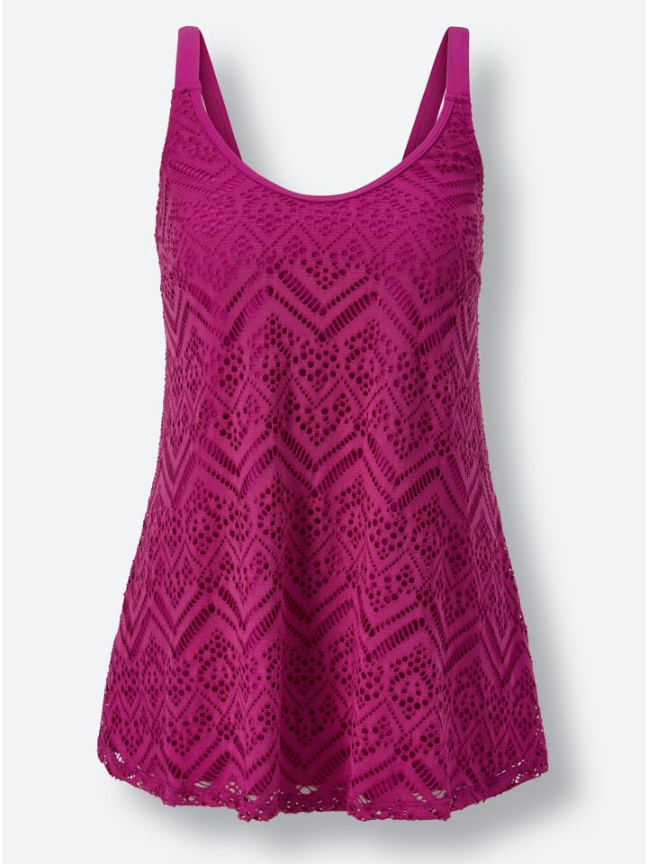 Свободный, свободный, объемный топ-танкини в многослойном стиле с отделкой из кружева с рисунком. Регулируемые бретели, мягкие чашки и пояс под грудью. Прямая спинка.