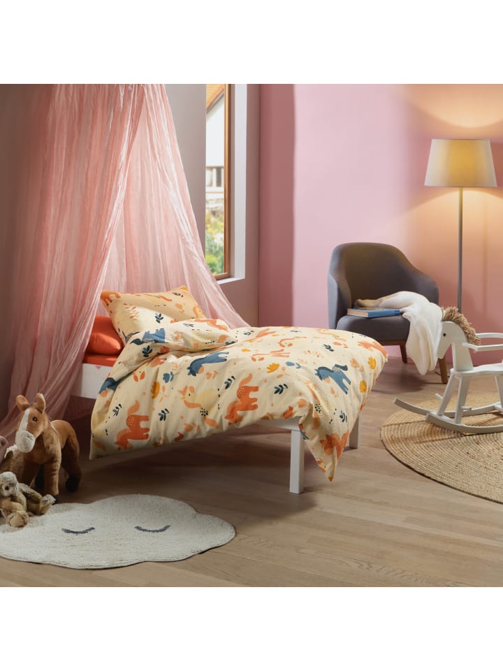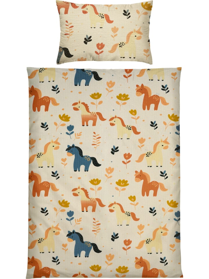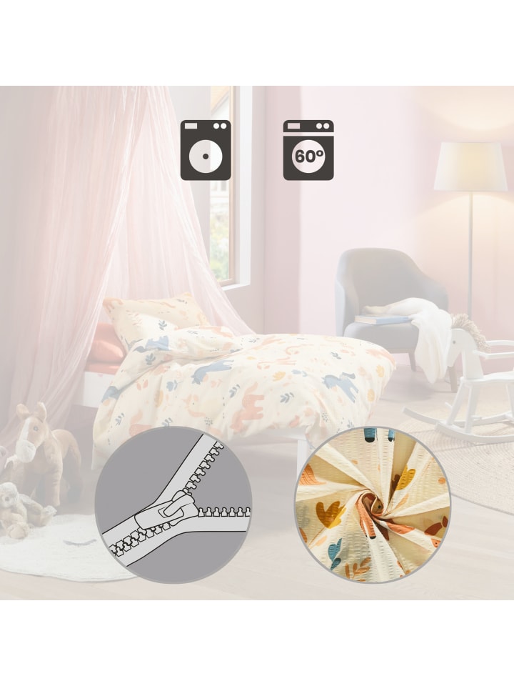 Детское постельное белье Erwin Müller из сирсакера. Ночь за ночью милые лошадки приглашают детей в страну снов, а днем очаровательное постельное белье создает уютную атмосферу. Приятная легкость, приятный для кожи и терморегулирующий эффект благодаря устойчивому жатому эффекту особенно популярны в теплое время года. За изделием очень легко ухаживать, так как оно быстро сохнет, не требует глажки и его можно быстро надеть обратно благодаря молнии.