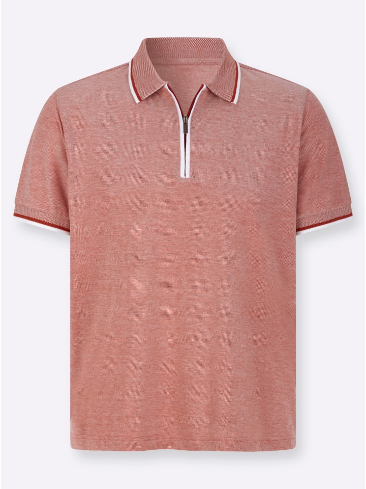 Рубашка-поло с короткими рукавами из меланжевой ткани пике. Узкие полоски на ребристом воротнике и манжетах, а также контрастная окантовка на короткой молнии создают спортивный образ.