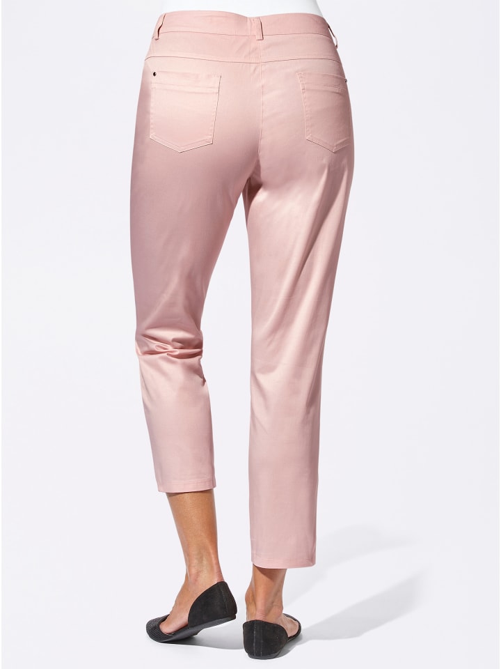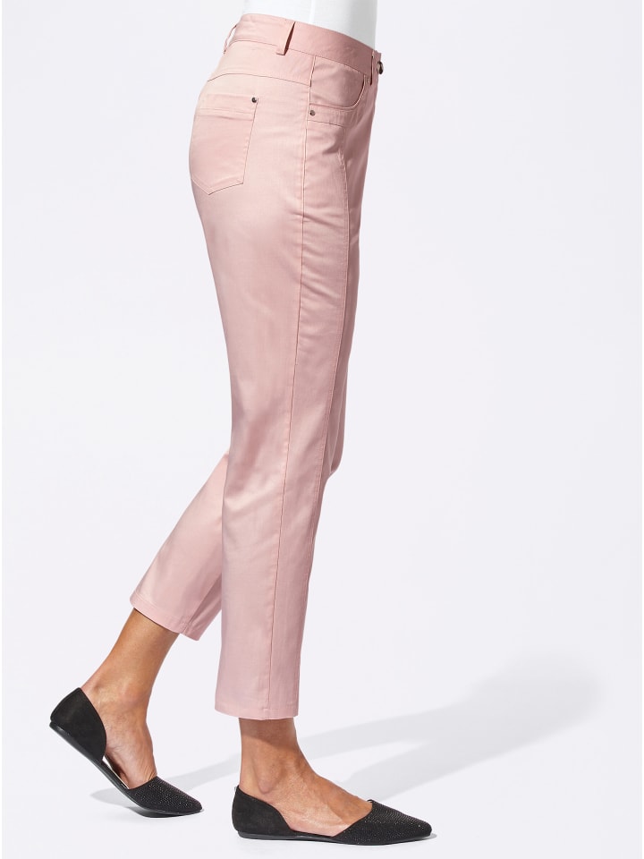 Эти воздушные брюки длиной 7/8 - популярный вариант для повседневного лета. Они имеют фигурный пояс, шлевки для ремня и застежку на пуговицу и молнию. Кокетка сзади обеспечивает отличную посадку. Серебристые заклепки украшают округлые прорезные карманы спереди и накладные карманы сзади. Декоративные боковые швы создают эффект удлинения. Длина брючины примерно 36 см.