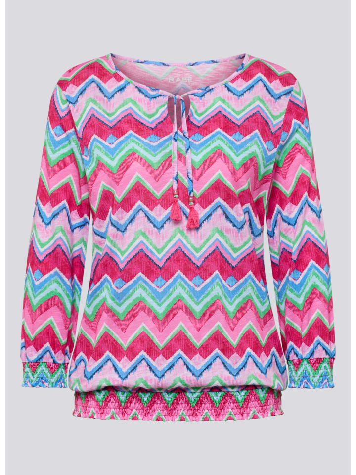 Эта туника добавит цвета и легкости вашему образу благодаря яркому зигзагообразному узору. Классический вырез туники с завязкой и кисточками добавляет женственности, а эластичные манжеты обеспечивают удобную посадку. Выразительный зигзагообразный узор в ярких цветах. Круглый вырез с разрезом и завязкой с кисточками. Эластичные манжеты и подол для удобной посадки. Приятная на ощупь трикотажная ткань с легкой текстурой. Идеально сочетается с простыми брюками или юбками для создания летних образов.