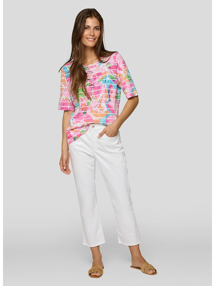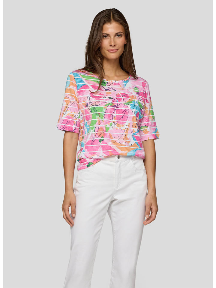 Эта футболка украшена эффектным принтом по всей поверхности в сочетании с тонкими горизонтальными полосками. Дизайн играет с яркими формами и линиями, добавляя яркий, креативный штрих любому образу. Классический круглый вырез горловины и рукава до середины голени делают эту футболку идеальным дополнением к расслабленным летним образам. Абстрактный принт по всей поверхности с полосатой текстурой. Круглый вырез горловины с контрастной окантовкой. Приталенный силуэт.