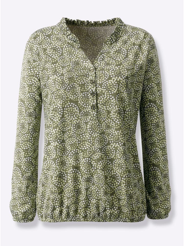 Гарантированно поднимет вам настроение: рубашка с принтом в веселый горошек из приятного мягкого микса материалов. Игривые оборки на комбинированном круглом и V-образном вырезе с короткой планкой на пуговицах. Пуговицы подобраны по цвету. Эластичные манжеты на длинных рукавах и подоле. Сертификация OCS