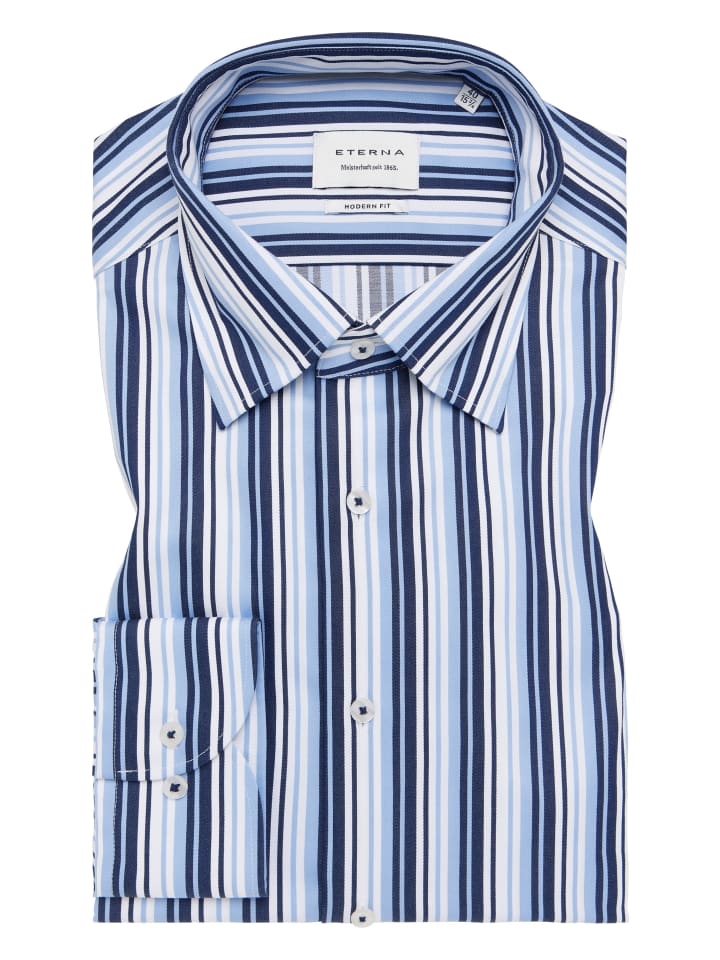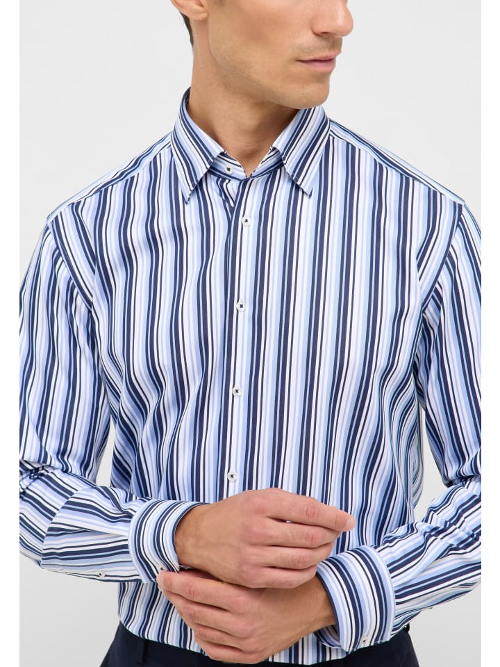 Откройте для себя стильную мужскую рубашку ETERNA с современным, приталенным кроем. Отложной воротник с пуговицами придает рубашке классический вид, а отложные манжеты позволяют носить ее по-разному. Полосатый дизайн обеспечивает элегантный вид, идеально подходящий для различных случаев.
