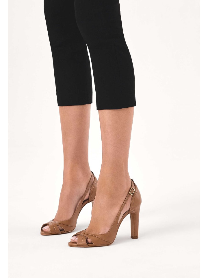 Эти туфли-лодочки, изготовленные из высококачественной натуральной кожи, являются воплощением роскоши и утонченного вкуса. Открытый носок излучает утонченность и чувственность, а вырезная союзка с декоративным ремешком с пряжкой придает им исключительную элегантность. Высокий каблук красиво подчеркивает и корректирует силуэт. Эти туфли-лодочки в элегантном золотом цвете подойдут как для повседневного, так и для вечернего образа.