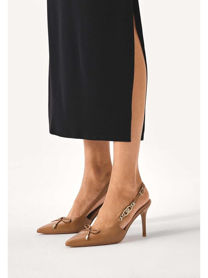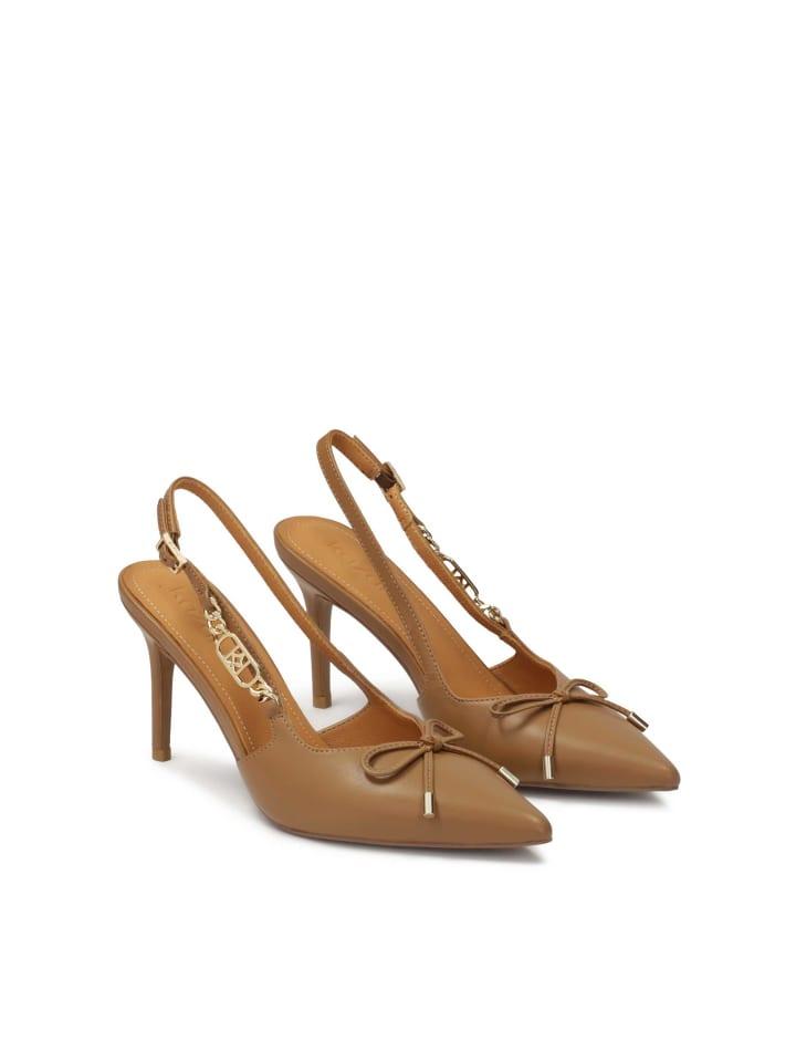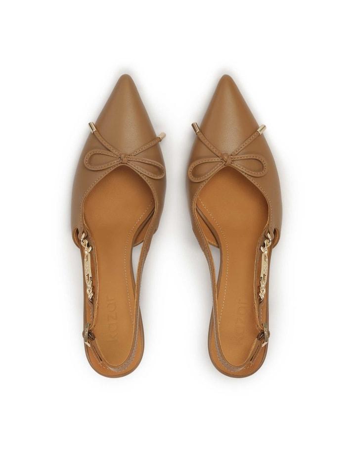 Туфли с открытой пяткой - элегантный и изысканный выбор для женщин, которые ценят классический стиль с нотками уникальных деталей. Изготовленные из натуральной кожи теплого коричневого оттенка, они имеют заостренный носок, который добавляет выразительности и элегантности, а также открытую пятку, которая придает общему дизайну легкость и утонченность. Ремешок за пяткой украшен металлической монограммой в сочетании с цепочкой, что придает стилю нотку роскоши и оригинальности. Изящный бант на носке еще больше подчеркивает женственность этих туфель. Эта модель подойдет как для элегантных случаев, так и для повседневного образа, добавив стиля и шика каждому образу.