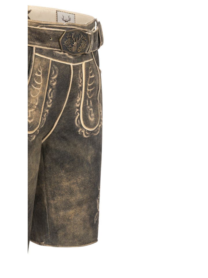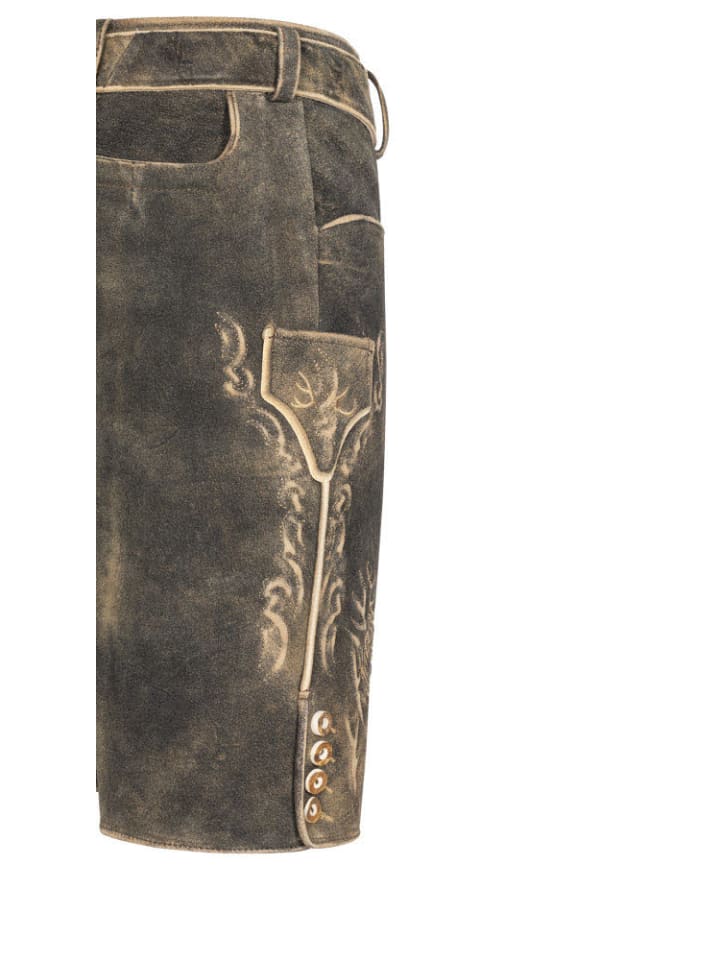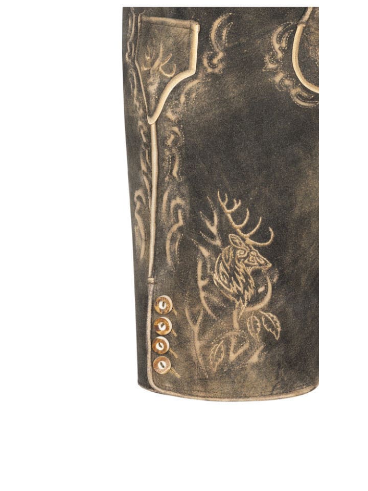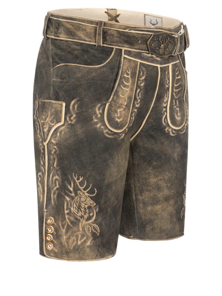 Ищете классические кожаные бриджи в современном стиле? Тогда у нас есть то, что вам нужно. Короткие кожаные бриджи Severin цвета сепии от Stockerpoint сочетают в себе традиции и современность. Светло-коричневая рельефная вышивка создает очень стильный образ. Вышивка с изображением оленя идеально дополняет дизайн. Есть два боковых кармана и задний карман для кошелька. Карман для хлебного ножа, также вышитый, расположен на правой штанине. Пуговицы на нагруднике и штанинах выполнены в стиле оленьих рогов. Пряжка на кожаном ремне с изображением оленьей головы - настоящая приманка для глаз. Традиционная ластовица сзади позволяет регулировать пояс, чтобы вы чувствовали себя комфортно даже после плотного обеда и в полной мере наслаждались каждым праздником.