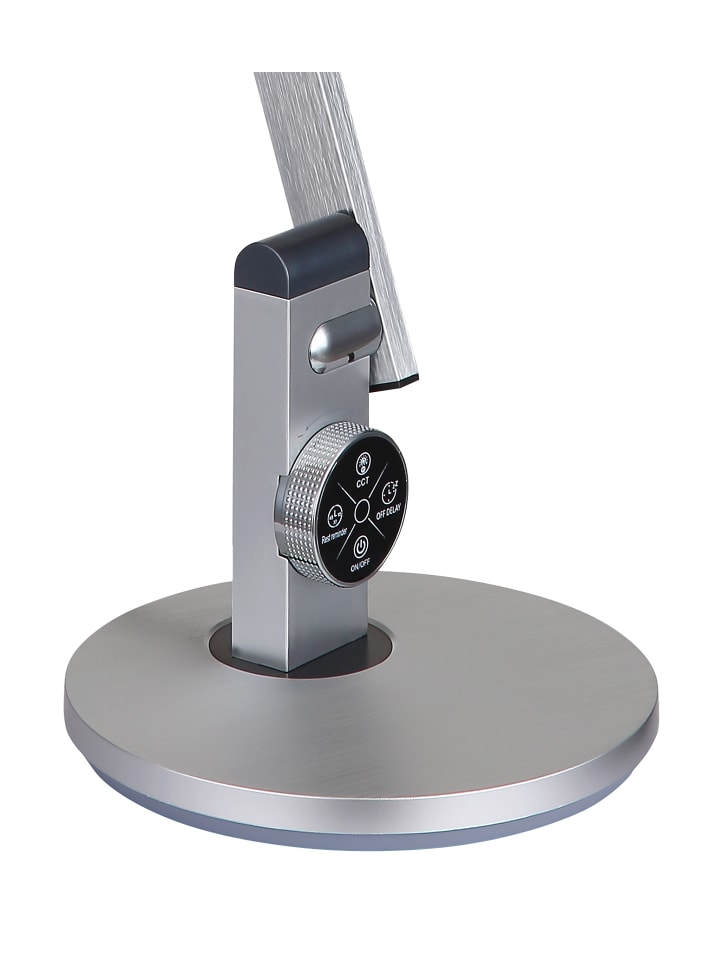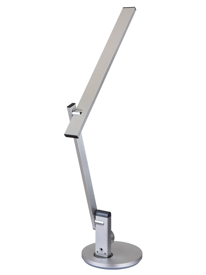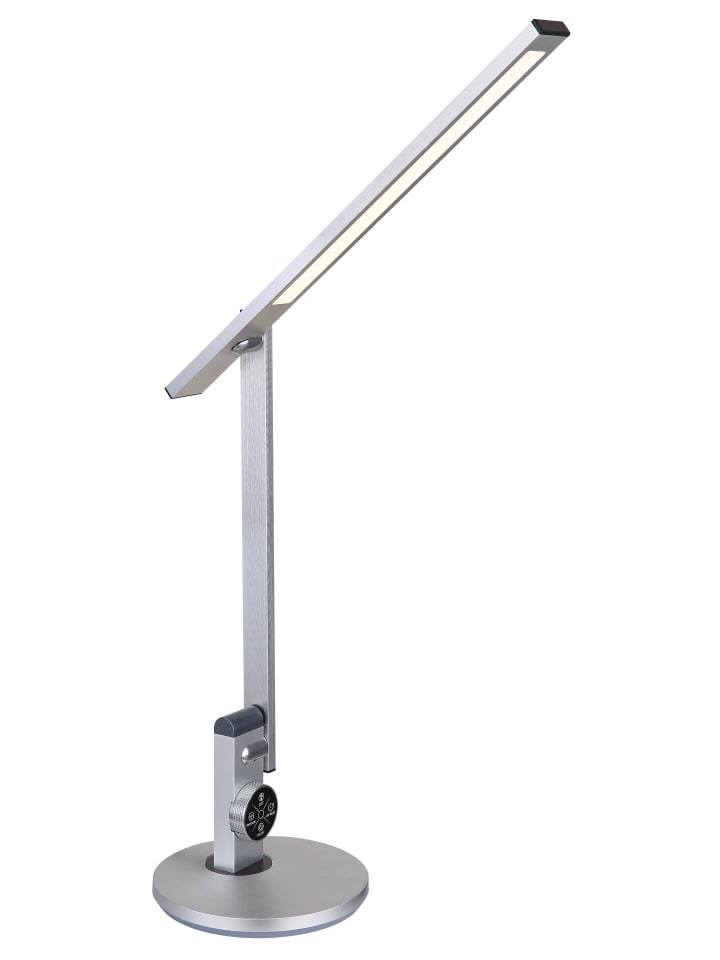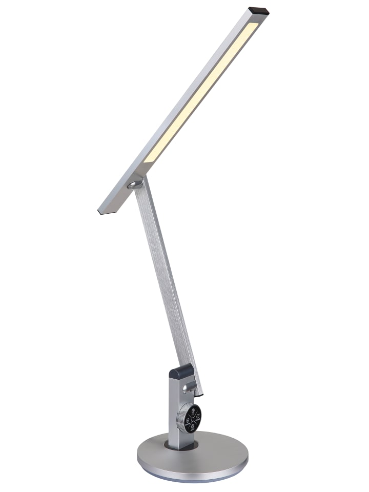 Настольная лампа, матовый алюминий, матовый серебристый пластик, матовый черный пластик, опаловый пластик, хромированный пластик, черный кабель из ПВХ, поворотный диммер, сенсорное включение/выключение, регулировка яркости, блокировка цвета, функция памяти, таймер, 1, регулируемый, Д x Ш x В: 635 x 190 x 499 мм, длина кабеля 1300 мм, в комплекте светодиод 12 Вт 230 В, источник света 50-970 лм, световой поток 30-620 лм, цветовая температура 3000/4000/6500 K