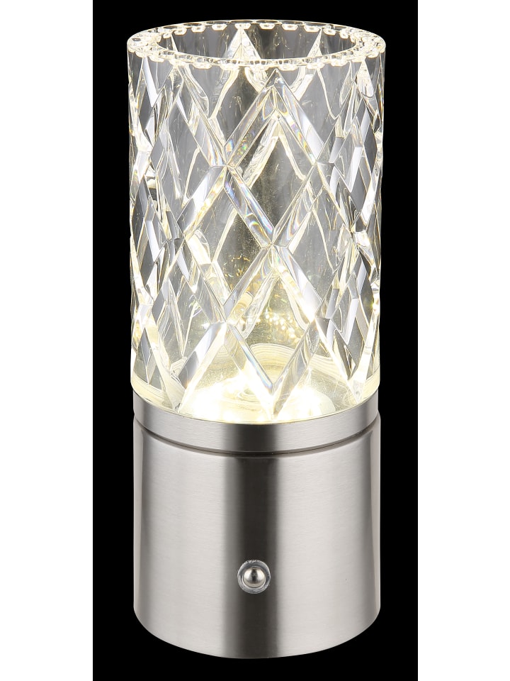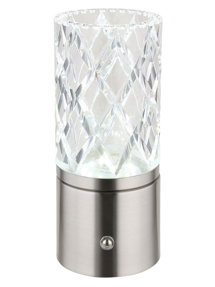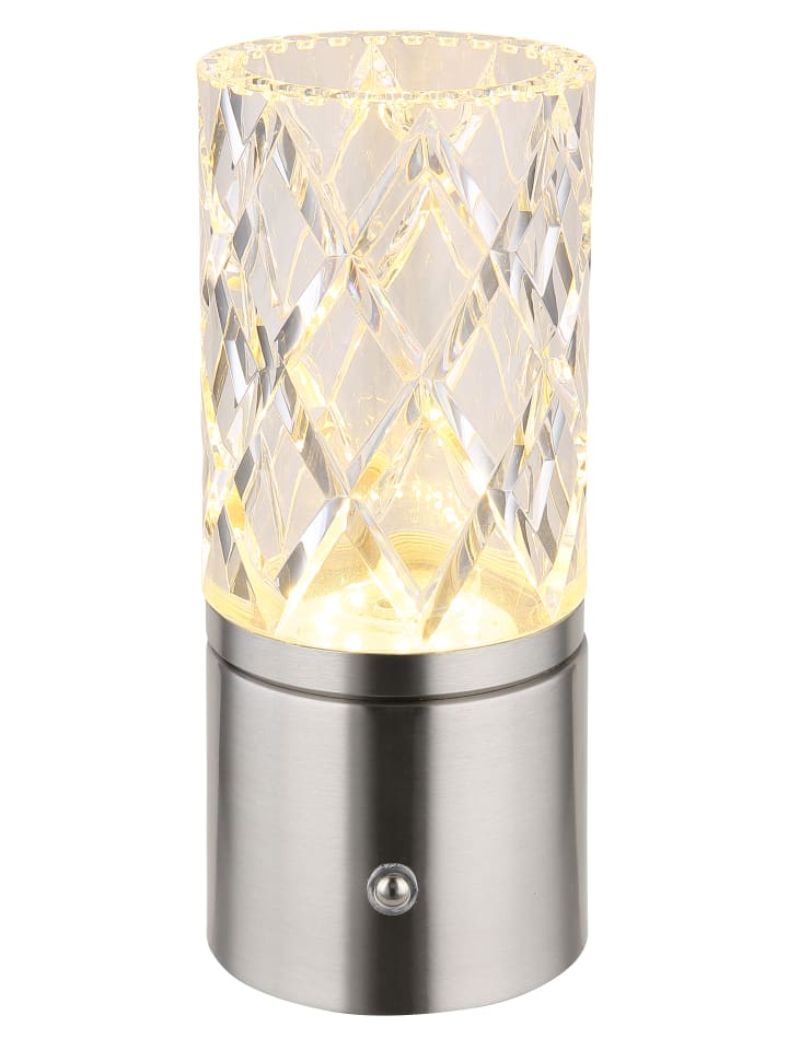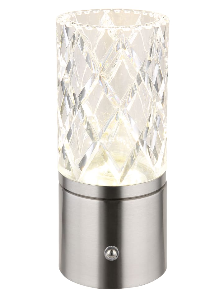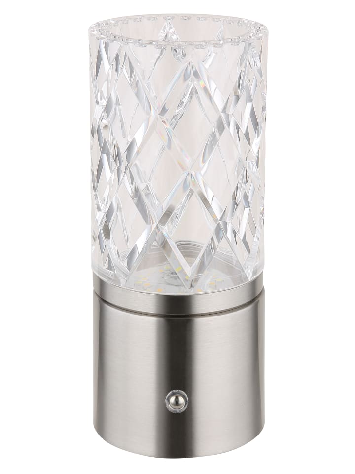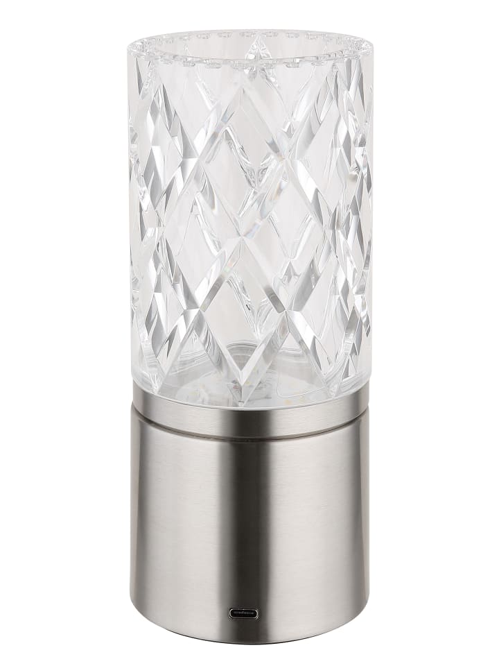 Настольная лампа, металл, матовый никель, хром, прозрачный акрил, белый кабель из ПВХ, сенсорное включение/выключение, регулировка яркости, бесступенчатый сенсорный диммер, блокировка цветов, USB-A 2.0 - USB-C, в комплекте батарейка CR18650 1800 мАч 3,7 В, диаметр: 80 мм, высота: 190 мм, длина кабеля 500 мм, в комплекте светодиод 2,5 Вт 5 В, источник света 243 лм, световой поток 185 лм, цветовая температура 2700/6500/4000 К