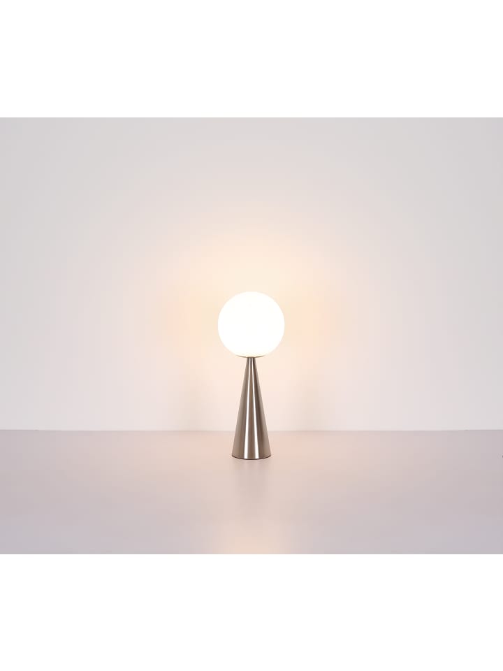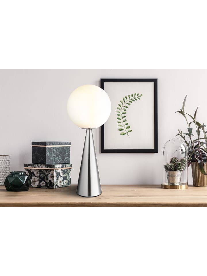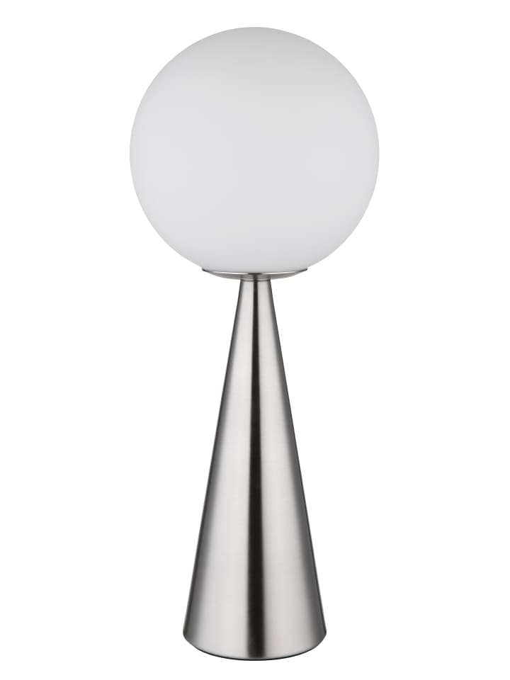 Настольная лампа, металл, матовый никель; плафон из опалового стекла; черный текстильный провод; клавишный выключатель на проводе; диаметр: 200 мм; высота: 495 мм; длина провода: 1460 мм; лампочка в комплект не входит: 1 x E27 40 Вт 230 В