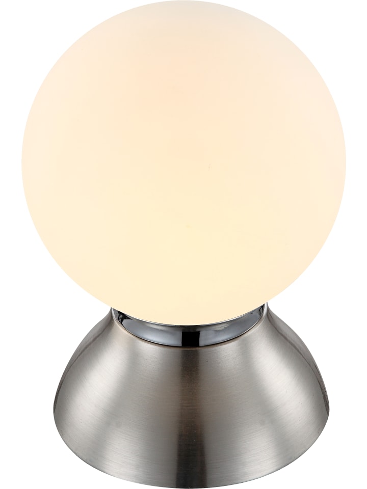 Настольная лампа, хромированный металл, матовое никелевое покрытие, опаловое стекло, сенсорное включение/выключение, диаметр: 140 мм, высота: 200 мм, длина кабеля: 1500 мм, в комплекте: 1 светодиод E14 мощностью 4,9 Вт, напряжением 230 В, световой поток 470 лм, световой поток 260 лм, цветовая температура 3000 К