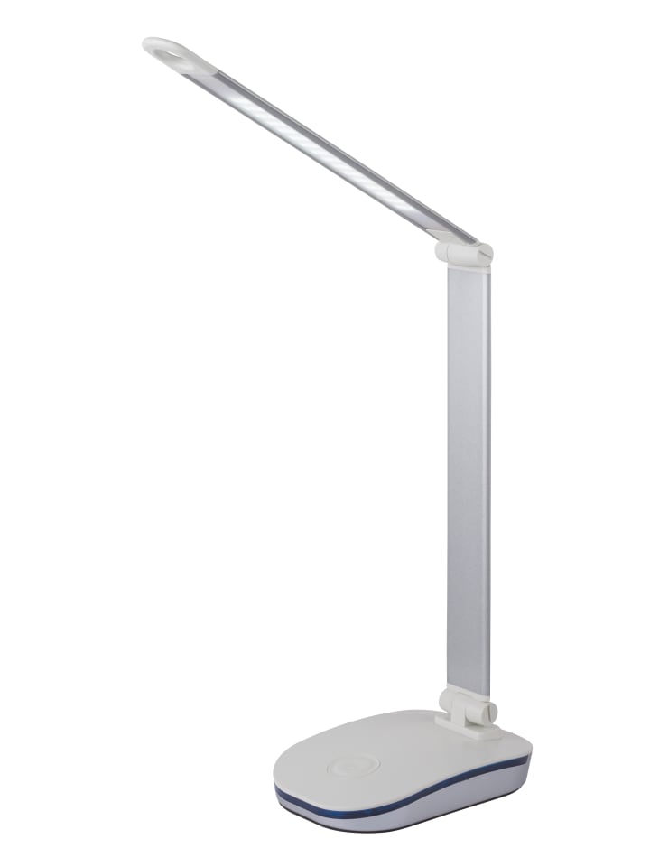 Настольная лампа, серебристый пластик, белый цвет, серебристый металлик, сенсорное включение/выключение, регулировка яркости, сенсорный диммер, 1 USB-выход, USB-разъем для зарядки мобильного телефона, ДxШxВ: 710x120x710 мм, длина кабеля 1600 мм, в комплекте светодиод 5 Вт 230 В, источник света 650 лм, светоотдача 300 лм, 4000 К