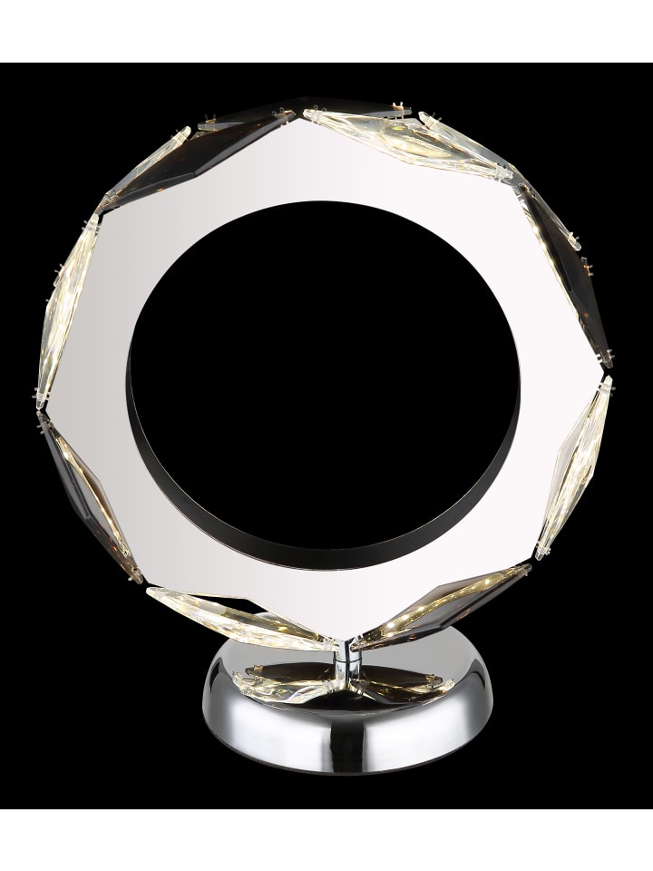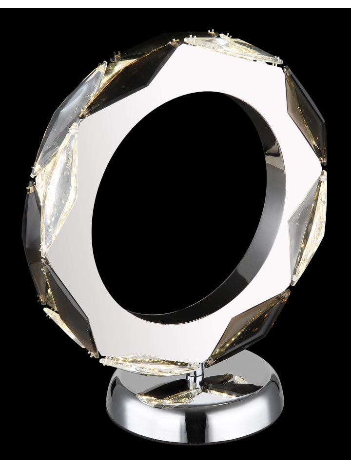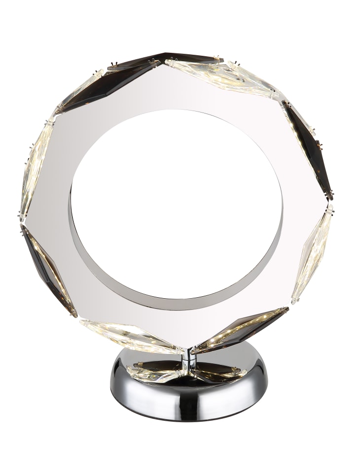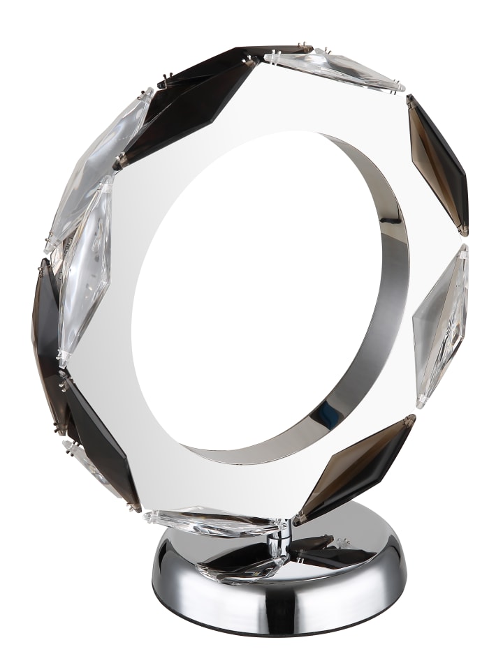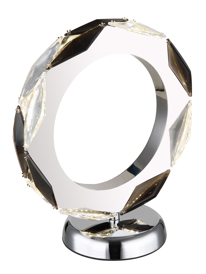 Настольная лампа, хромированный металл, дымчатые и прозрачные акриловые кристаллы, клавишный выключатель на проводе, размеры (Д x Ш x В): 240 x 130 x 270 мм, длина провода 1500 мм, в комплекте светодиод 8 Вт 230 В, источник света 720 лм, световой поток 150 лм, цветовая температура 4000 К