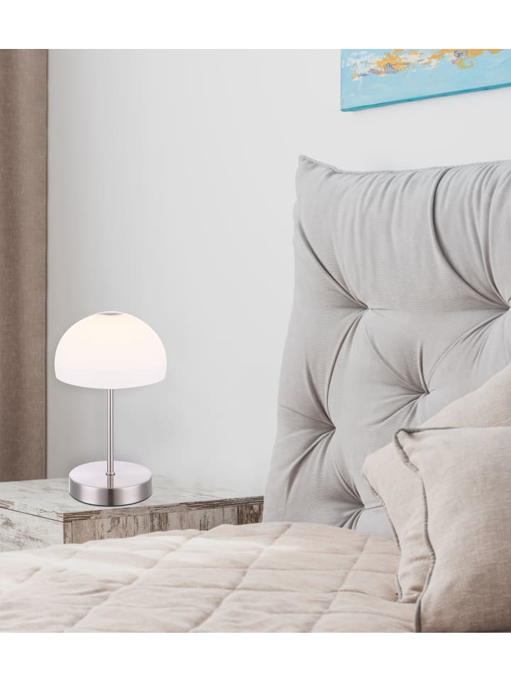Настольная лампа, металл, матовое никелевое покрытие, опаловое стекло, сенсорное включение/выключение, диаметр: 150 мм, высота: 270 мм, длина кабеля: 1500 мм, в комплекте светодиод 5 Вт 230 В, источник света: 500 лм, световой поток: 360 лм, цветовая температура: 3000 К