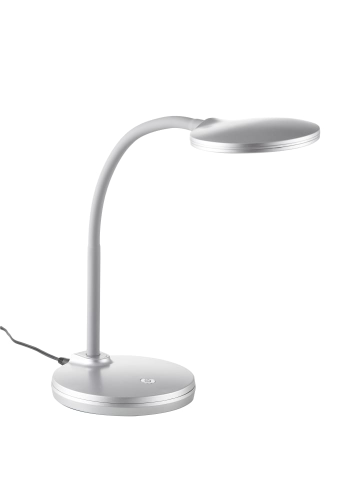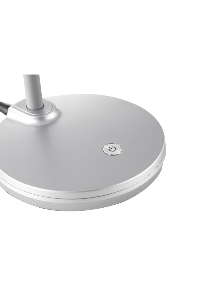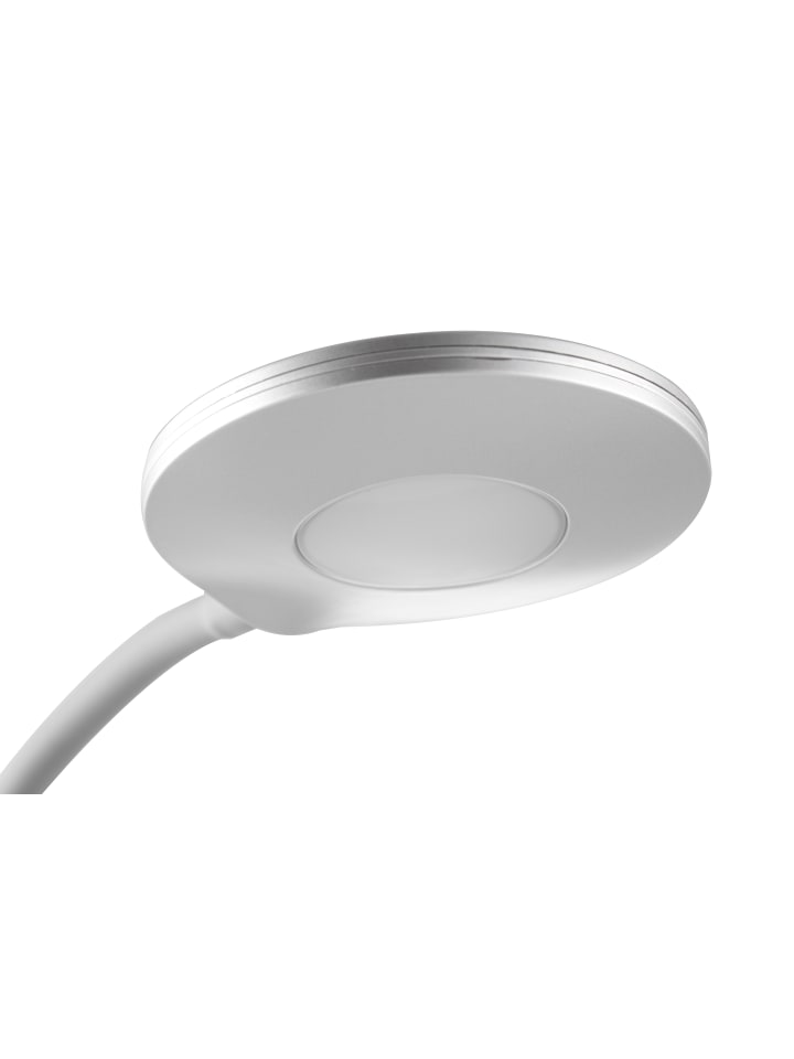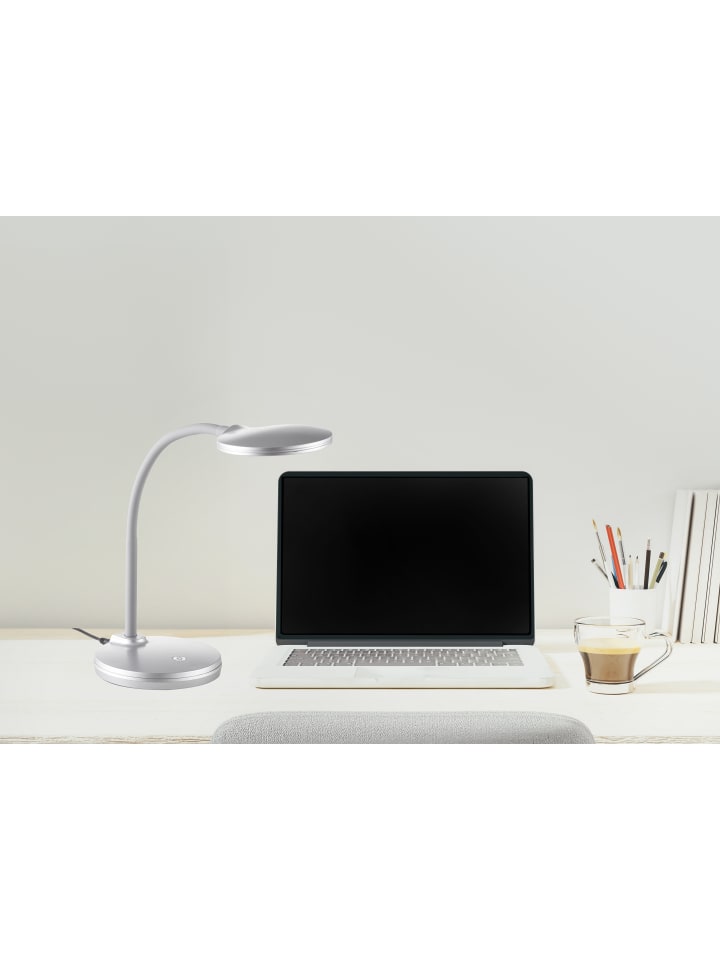 Настольная лампа, серебристый пластик, кабель из ПВХ, сенсорное включение/выключение, регулировка яркости, ступенчатый переключатель, гибкая, дополнительные функции: 3-ступенчатая регулировка яркости, ДxШxВ: 150x132x320 мм, в комплекте светодиод 4,6 Вт 230 В, источник света 500 лм, световой поток 300 лм, цветовая температура 3000 К