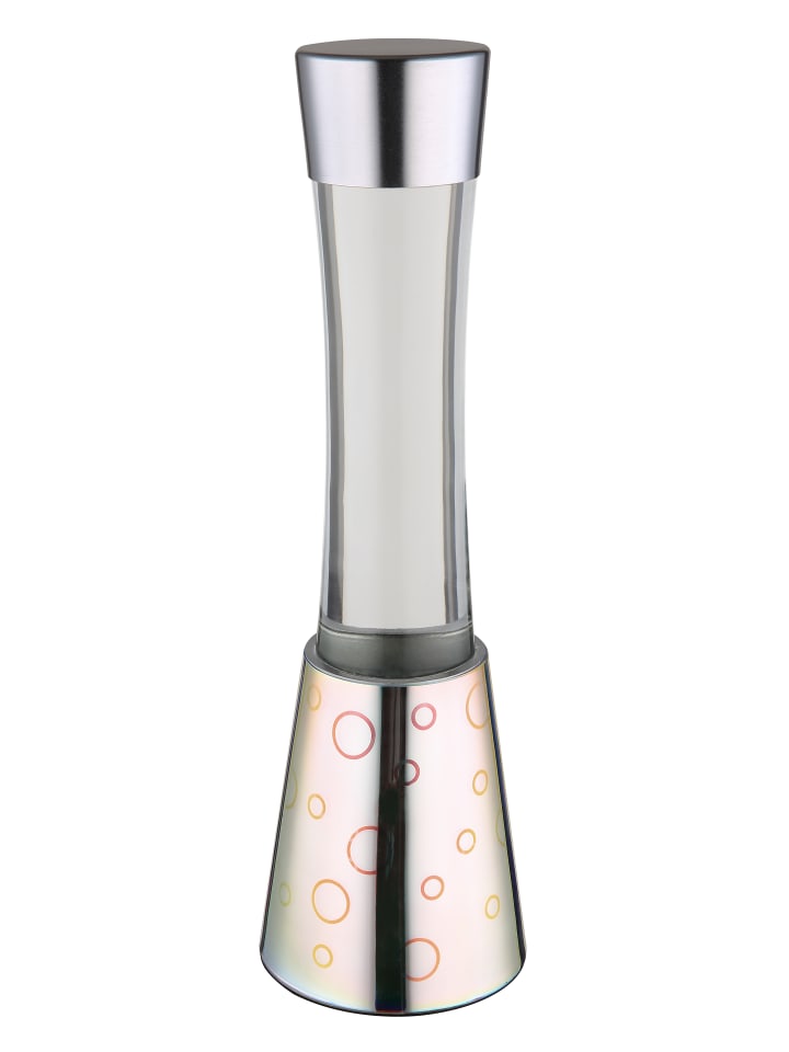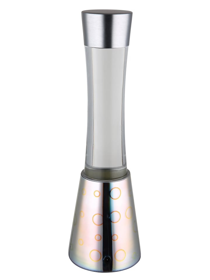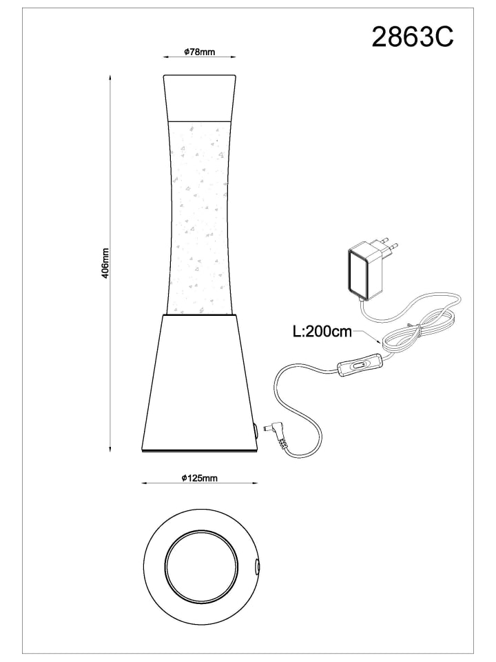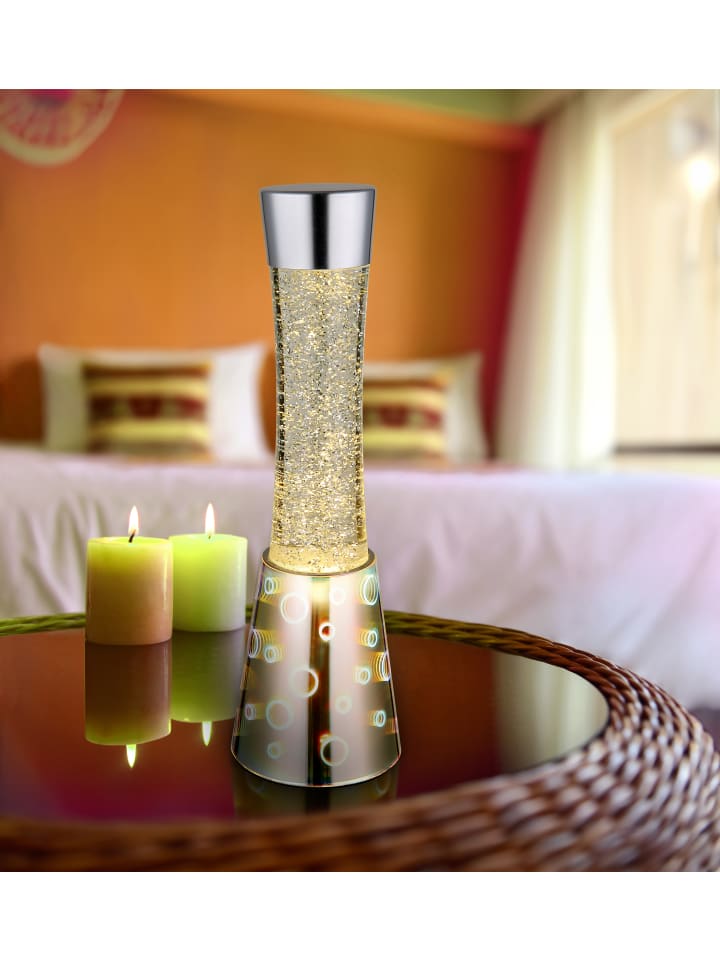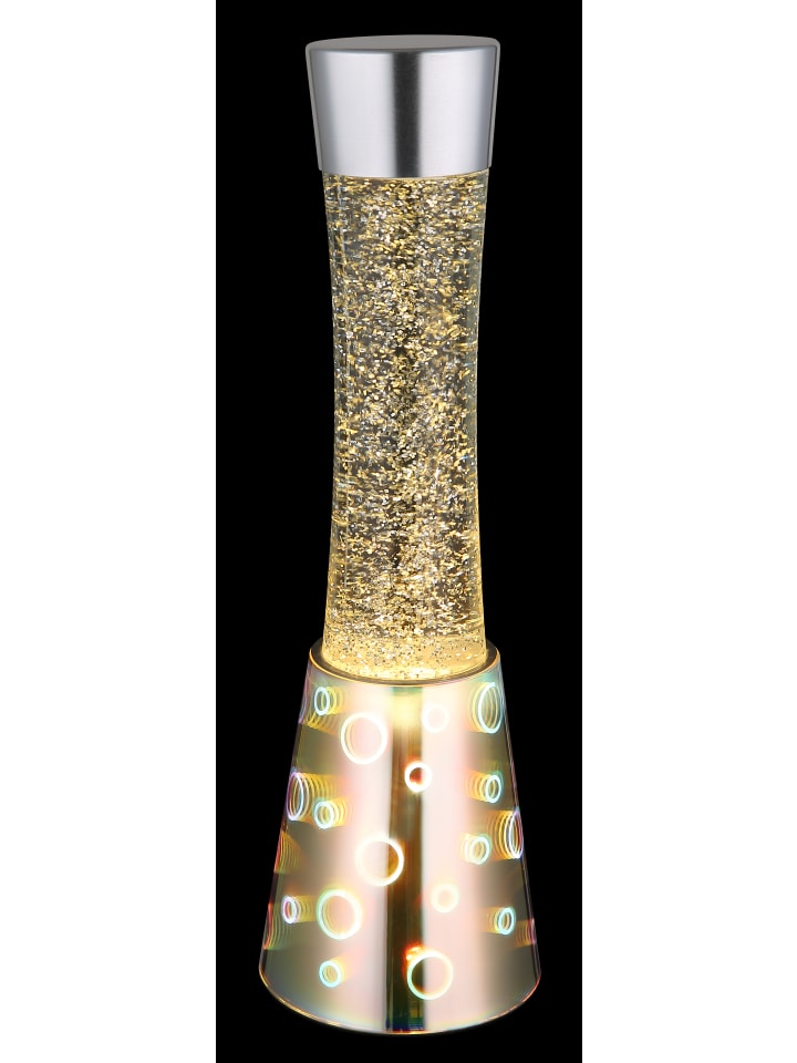 Настольная лампа, хромированное стекло с 3D-эффектом, хромированный алюминий, прозрачное стекло, черный кабель из ПВХ, клавишный выключатель на кабеле, адаптер в комплекте, блестящая лампа, прозрачная жидкость, серебристые блестки, ø: 125 мм, H: 406 мм, длина кабеля 2000 мм, в комплекте светодиод 25 Вт 230 В, источник 26 лм, световой поток 386 лм, цветовая температура 3000 К