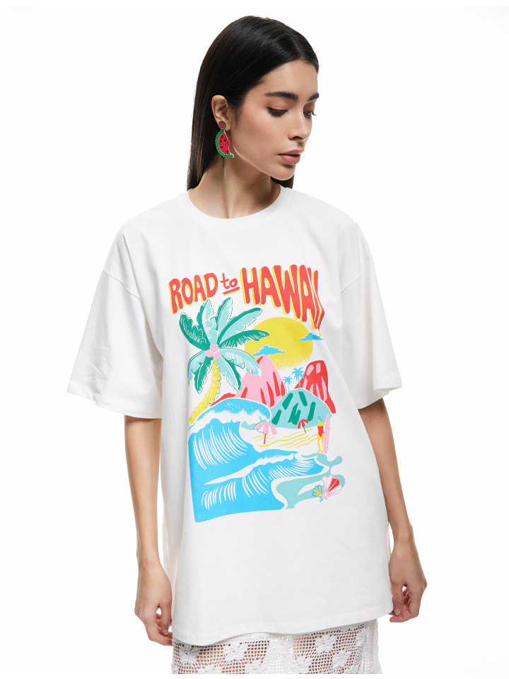 Прочувствуйте лето в этой стильной футболке свободного кроя. Яркий тропический принт создает свежий образ, а удобный крой идеально подходит для повседневной носки. Мягкая хлопковая ткань обеспечивает максимальный комфорт, а классический круглый вырез делает ее универсальной. Идеально подходит для отдыха или в качестве дополнения к повседневному образу.