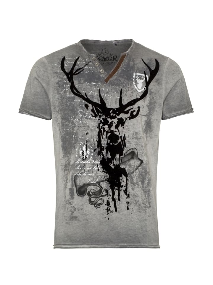 Традиционная серая футболка в стиле Элвиса. Эта современная мужская футболка выглядит по-настоящему брутально. Основной цвет верха переплетается с более темными тонами. Крупный принт с изображением головы оленя украшает переднюю часть. Рога доходят до плеч, а логотип бренда заметно выделяется на спине - идеальная футболка для отдыха и барбекю.