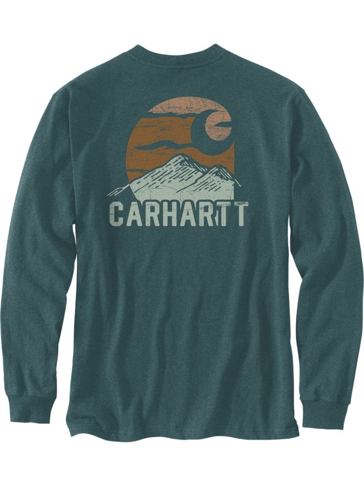 Свободный крой · Плотность 6,75 унций/ярд² - 229 г/м² · Плотный трикотаж · Длинные рукава · Круглый вырез на резинке · Нагрудный карман слева · Манжеты на резинке · Графический принт Carhartt «Mountain Logo» на спине · Этикетка Carhartt пришита к карману