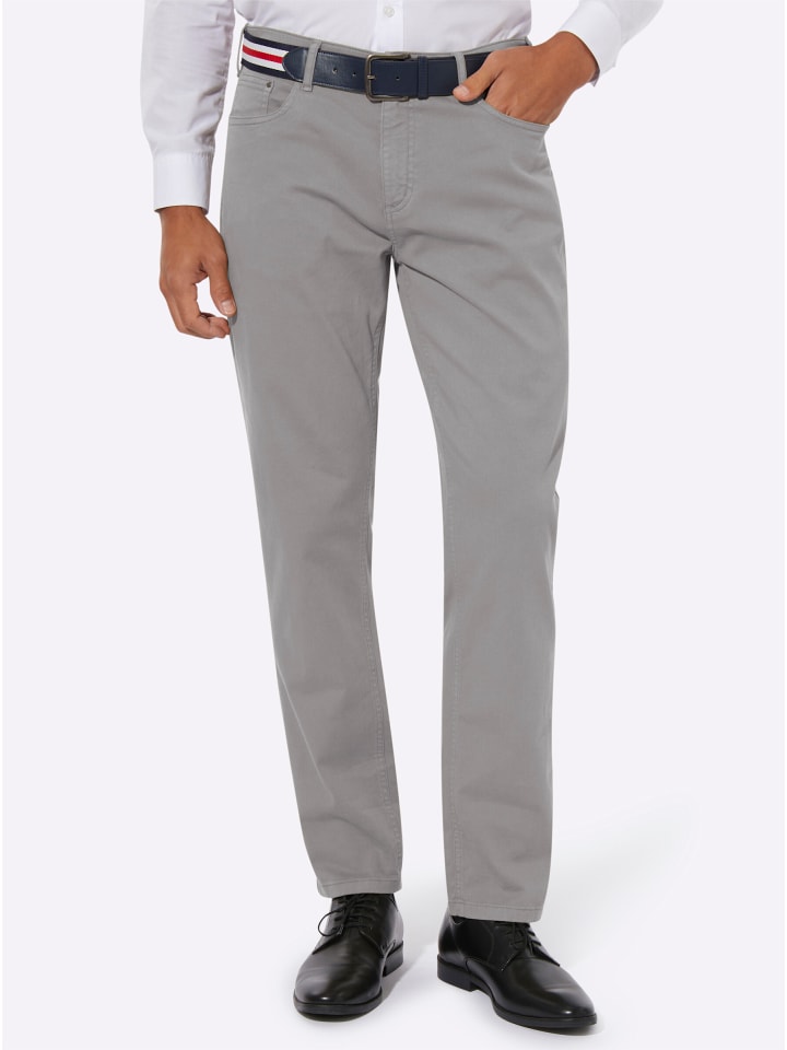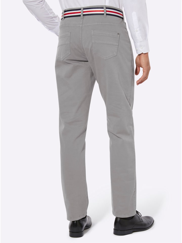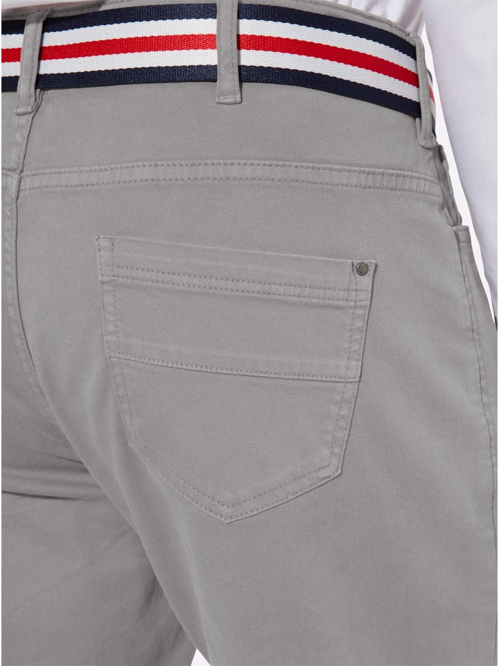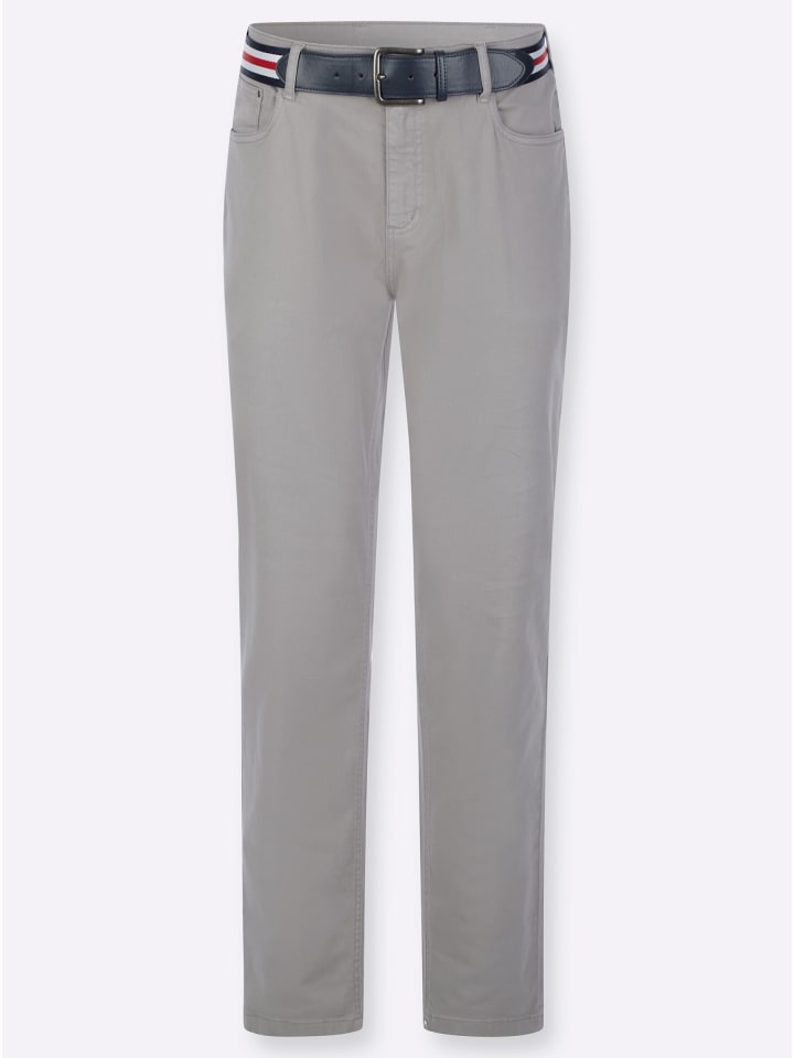 Универсальные брюки из твила из удобной хлопчатобумажной ткани с эластичным плетением. Втачной пояс со шлевками для ремня, застежка на пуговицу и молнию спереди. Приталенная кокетка сзади. Повседневный крой с пятью карманами: 2 передних кармана и дополнительный карман для монет, а также 2 накладных кармана сзади. Серебристые заклепки на карманах. В комплект входит полосатый ремень с пряжкой из искусственной кожи.